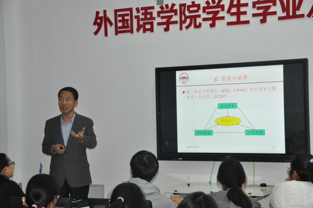 讲座中,常老师做了题为《英语文学作品阅读与英语学习—兼谈语境缺失时提高英语能力的途径和方法》的报告。报告指出:英语学科核心素养主要包括语言能力、文化意识、思维品质和学习能力,要坚持培养英语综合能力。阅读英语文学作品是中国语境下学习英语、提高英语能力的有效途径和方法。要保证阅读量,从阅读中汲取语言知识,百科知识。在阅读材料和题材的选择上,必须要符合自身的年龄和兴趣,最大程度的引发阅读意愿,轻松学习英语。要充分发挥自身的认知能力,以英语写作作为深化自身阅读能力的手段,学有所用,用从学出,弥补英语学习外部环境的不足。要把英语语感的培养即英语能力的内化作为英语学习的最终目标。