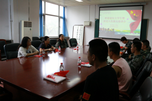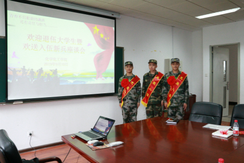 携笔从戎,无悔青春。金秋九月,化学化工学院2名大学生圆满完成军营锻炼,重返学校,同时又有3名男儿携笔从戎,应征入伍。9月10日,化学化工学院召开2019年欢送入伍新兵暨欢迎退伍大学生座谈会。学院有关负责人、各年级辅导员、退伍老兵和入伍新兵参加。