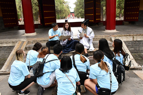 10日至13日,实践团队来到文化名地山东,领略儒家文化。在曲阜三孔中外学生身着孔服,高声诵读“有朋自远方来,不亦乐乎”等《论语》中名句;在李清照祠堂,中国学生现场朗读和讲解中国第一女词人词作和事迹,领略中华诗词文化;中外学生相互帮扶登顶泰山,感受泰山浓厚的文化底蕴和诗词氛围。