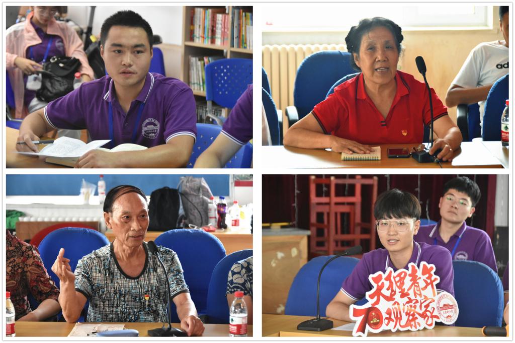 座谈会上,支教大学生、“青马”学员、学生党员等学生代表分享自己的基层实践感受,社区应急小分队的老党员志愿者代表们分享了自己在服务居民的平凡工作中的点滴奉献,同时勉励青年学生珍惜时光,锻炼本领。会后,实践团还采访了部分老党员、老军人、社区工作人员和普通居民,共话社区发展,共祝祖国70岁华诞。
