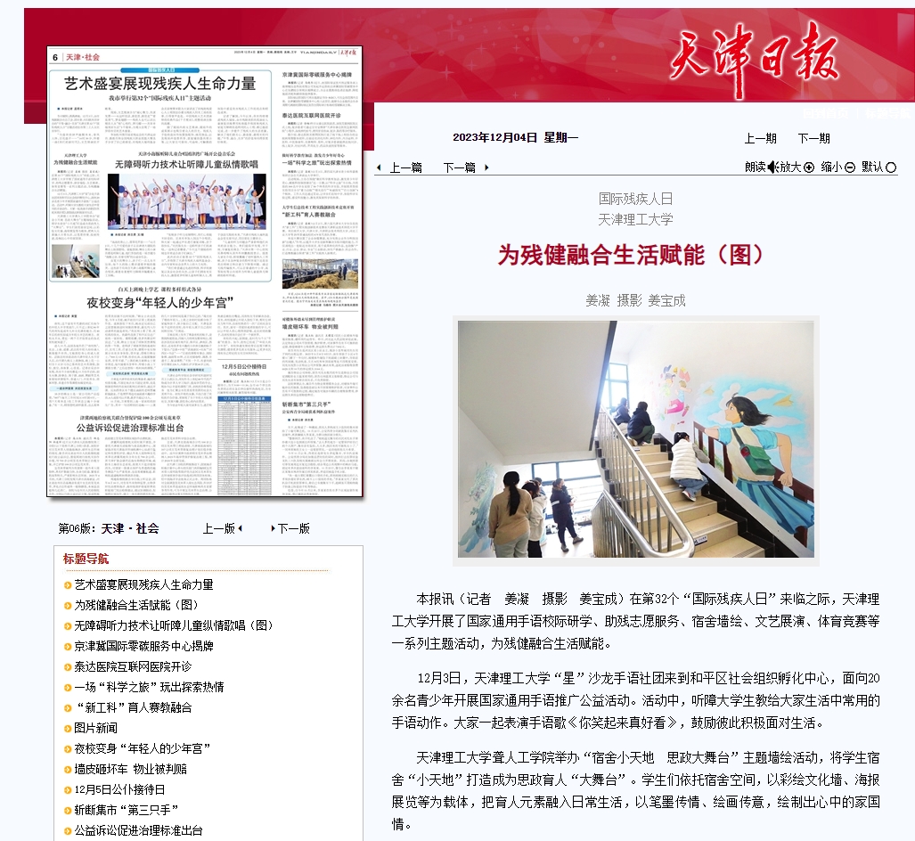 本报讯(记者 姜凝 摄影 姜宝成)在第32个“国际残疾人日”来临之际,开云官方在线入口开展了国家通用手语校际研学、助残志愿服务、宿舍墙绘、文艺展演、体育竞赛等一系列主题活动,为残健融合生活赋能。