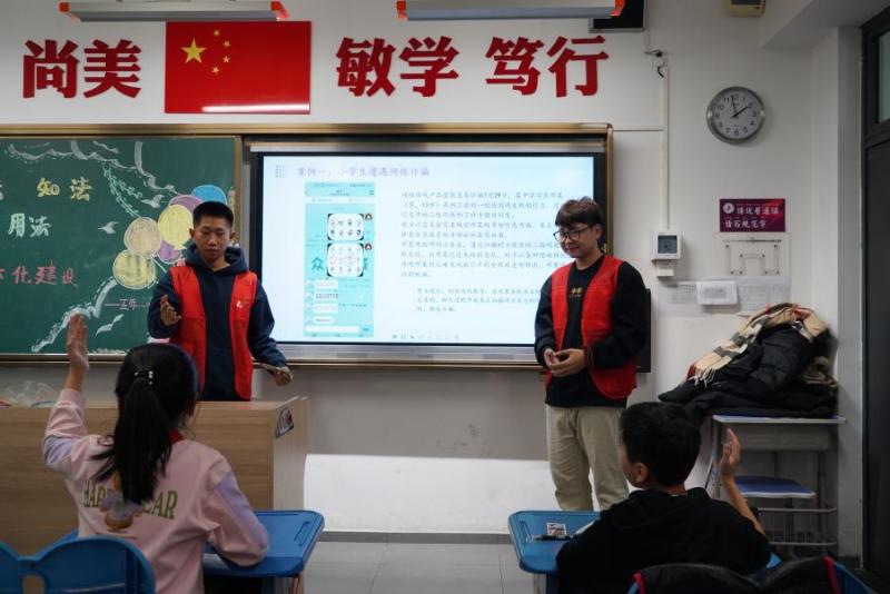 青年大学生还为小学生们讲解了《未成年人网络保护条例》,从制定条例的重要意义、未成年人遭遇网络不法侵害时如何有效进行维权、未成年人如何合理使用网络等多个方面展开讲解,还现场演绎了根据小学生行为特点和现实案例改编的网络诈骗模拟情景剧,引发了同学们阵阵欢笑,也让同学们直观感受到网络安全风险和不良网络言论可能引发的严重后果,引导大家文明上网、合法合理合规用网。