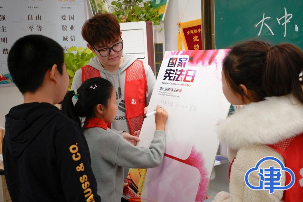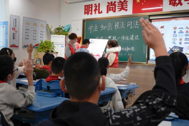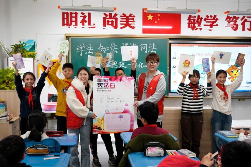 在课堂上,青年大学生带领小学生们学习宪法,用实例向同学们讲述宪法如何融入生活,如何为我们的健康成长保驾护航,引导同学们深刻领会宪法精神。