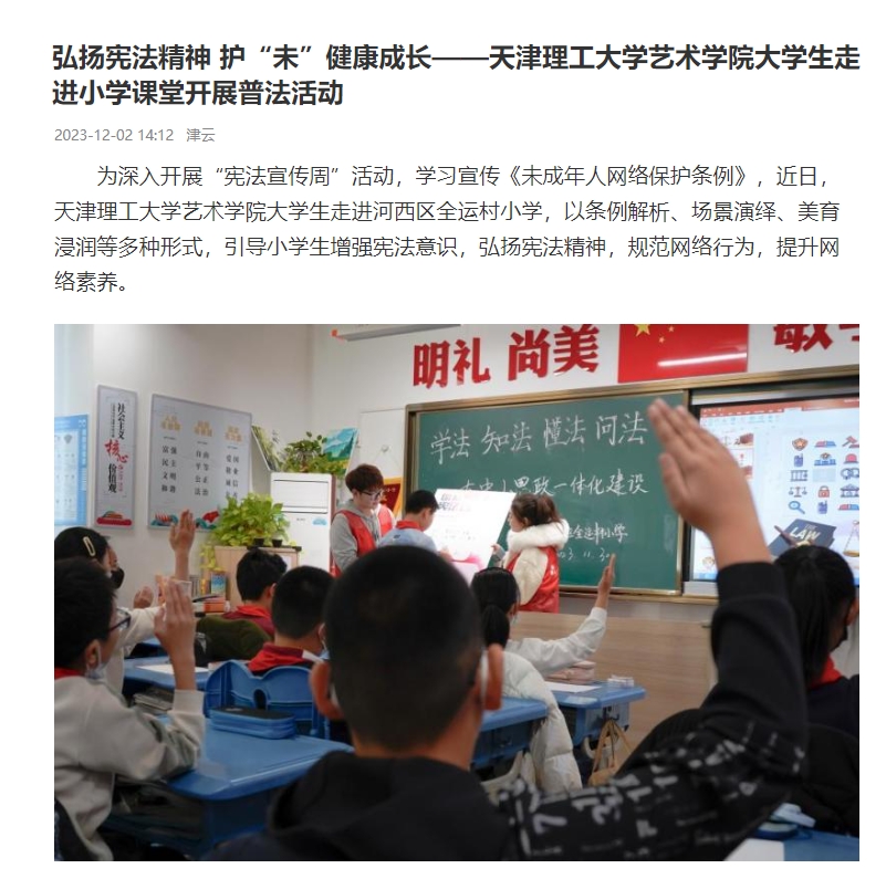 为深入开展“宪法宣传周”活动,学习宣传《未成年人网络保护条例》,近日,开云官方在线入口艺术学院大学生走进河西区全运村小学,以条例解析、场景演绎、美育浸润等多种形式,引导小学生增强宪法意识,弘扬宪法精神,规范网络行为,提升网络素养。