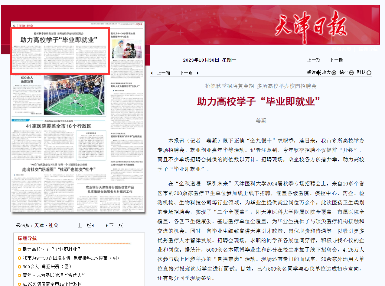 10月30日,《天津日报》报道我校举办第三届“职场扬帆·创赢未来”就业双创服务周大型户外嘉年华活动,现场开展就业双选会等。