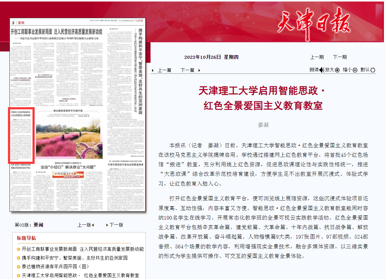10月26日,《天津日报》报道我校马克思主义学院智能思政·红色全景爱国主义教育资源平台启用,将红色场馆“搬进”教室。全文如下:
