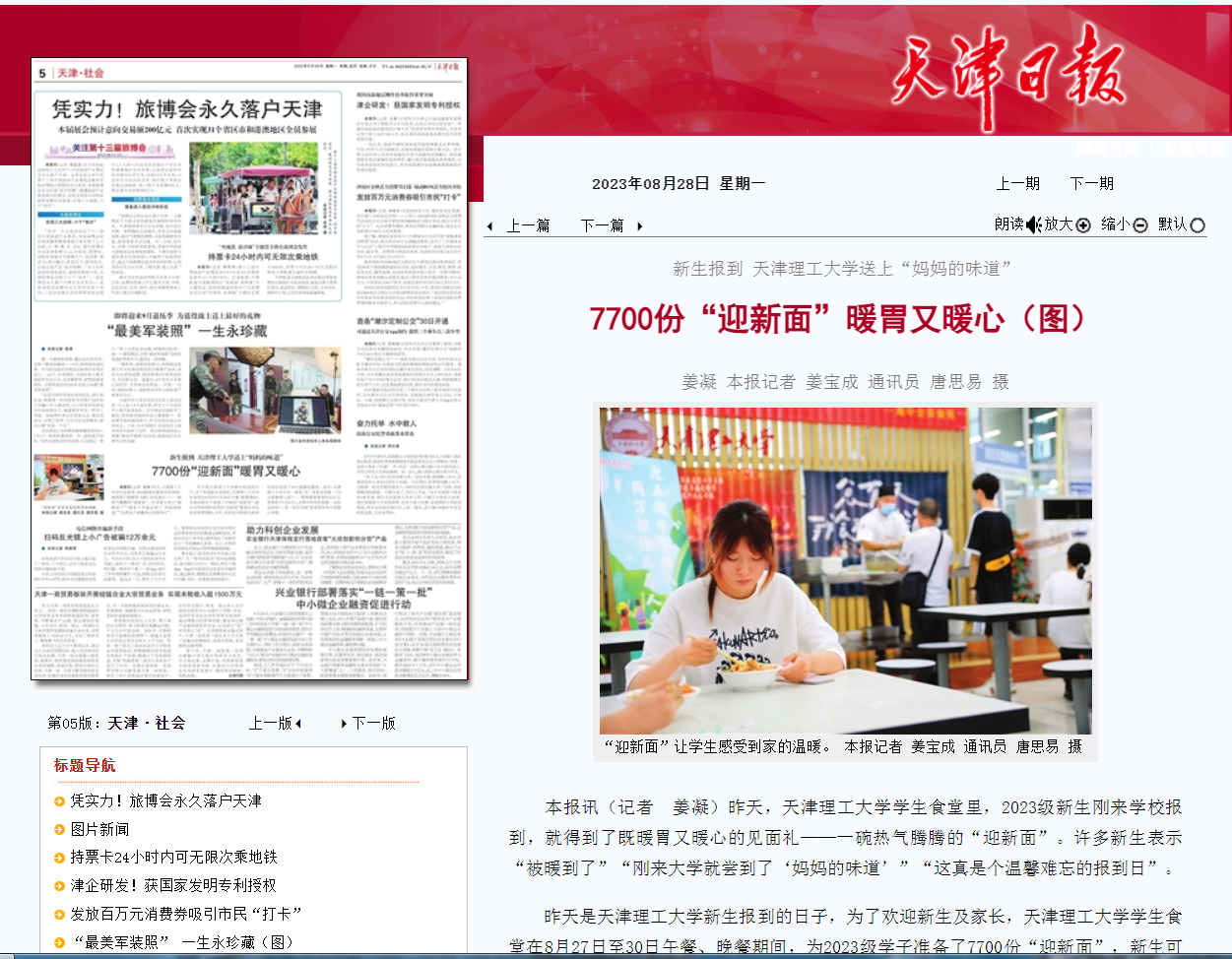 8月28日,《天津日报》报道我校迎新生特色做法,为新生送上“妈妈的味道”,7700份“迎新面”暖胃又暖心。全文如下: