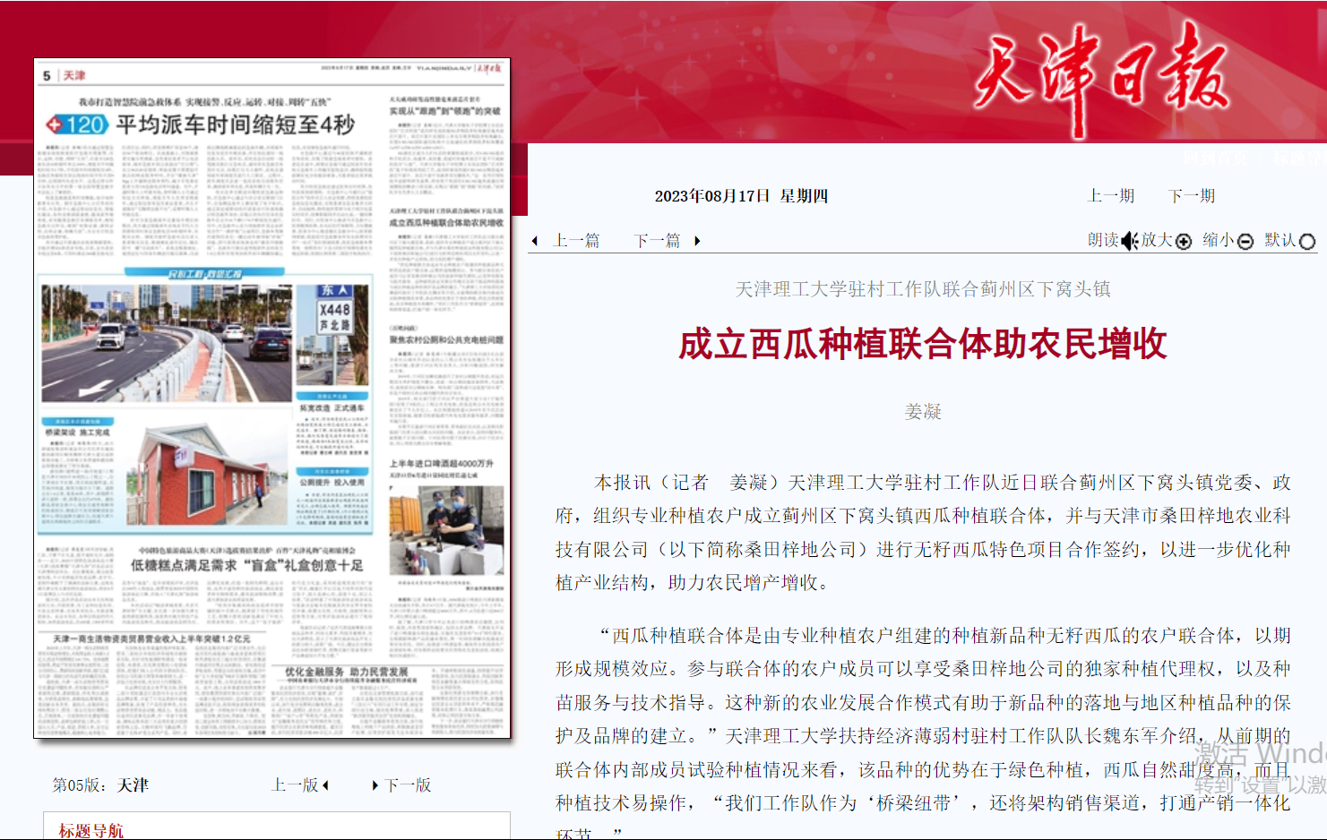 近日,《天津日报》报道我校驻村工作队联合蓟州区下窝头镇党委、政府,组织专业种植农户成立蓟州区下窝头镇西瓜种植联合体,并与天津市桑田梓地农业科技有限公司进行无籽西瓜特色项目合作签约,以进一步优化种植产业结构,助力农民增产增收。全文如下: