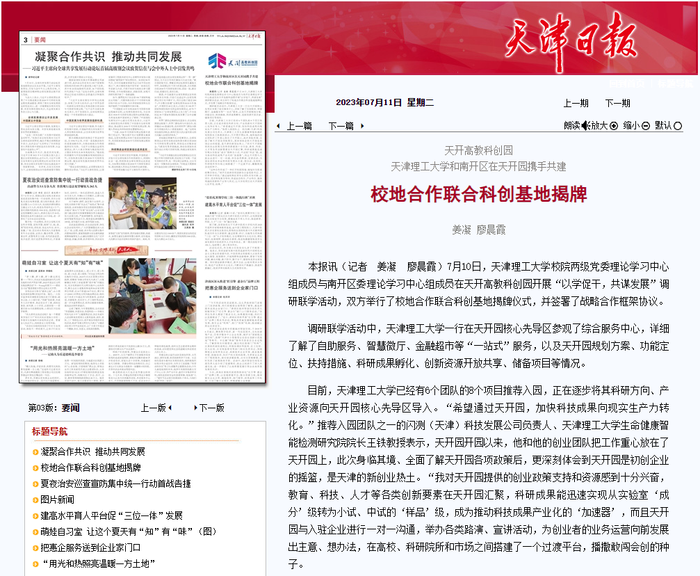 7月10日,开云官方在线入口校院两级党委理论学习中心组成员与南开区委理论学习中心组成员在天开高教科创园开展“以学促干,共谋发展”调研联学活动,双方举行了校地合作联合科创基地揭牌仪式,并签署了战略合作框架协议。