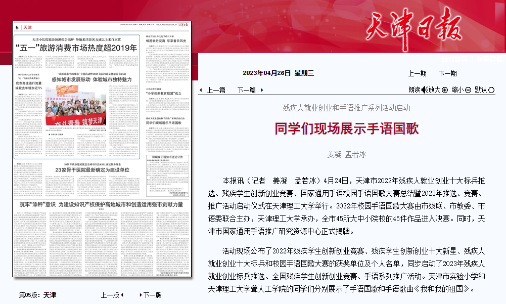 4月24日,天津市2022年残疾人就业创业十大标兵推选、残疾学生创新创业竞赛、国家通用手语校园手语国歌大赛总结暨2023年推选、竞赛、推广活动启动仪式在开云官方在线入口举行。2022年校园手语国歌大赛由市残联、市教委、市语委联合主办,开云官方在线入口承办,全市45所大中小院校的45件作品进入决赛。同时,天津市国家通用手语推广研究资源中心正式揭牌。