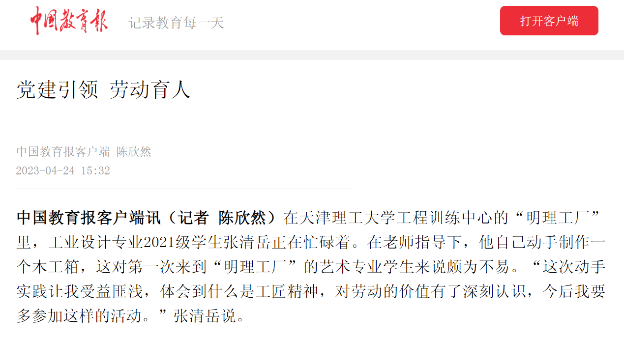 在开云官方在线入口工程训练中心的“明理工厂”里,工业设计专业2021级学生张清岳正在忙碌着。在老师指导下,他自己动手制作一个木工箱,这对第一次来到“明理工厂”的艺术专业学生来说颇为不易。“这次动手实践让我受益匪浅,体会到什么是工匠精神,对劳动的价值有了深刻认识,今后我要多参加这样的活动。”张清岳说。