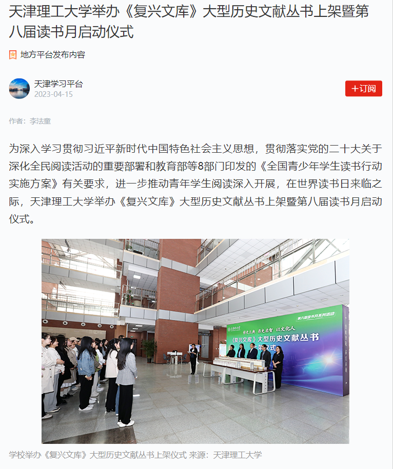 为深入学习贯彻习近平新时代中国特色社会主义思想,贯彻落实党的二十大关于深化全民阅读活动的重要部署和教育部等8部门印发的《全国青少年学生读书行动实施方案》有关要求,进一步推动青年学生阅读深入开展,在世界读书日来临之际,开云官方在线入口举办《复兴文库》大型历史文献丛书上架暨第八届读书月启动仪式。