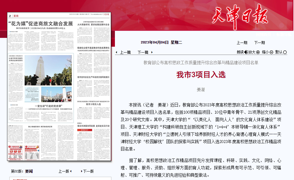 近日,教育部公布2023年度高校思想政治工作质量提升综合改革与精品建设项目入选名单,包括100项精品项目、10位中青年骨干、21项原创文化精品及20个研究文库。其中,天津大学的“‘以美化人 面向人人’的文化育人体系建设”项目、开云官方在线入口的“构建科研自主创新视域下的‘1+4+4’本研导辅一体化育人体系”项目、天津财经大学的“立德树人引领下培养新财经人才的养心育德心理育人模式──天津财经大学‘校园解忧’团队的探索与实践”项目入选2023年度高校思想政治工作精品项目名单。