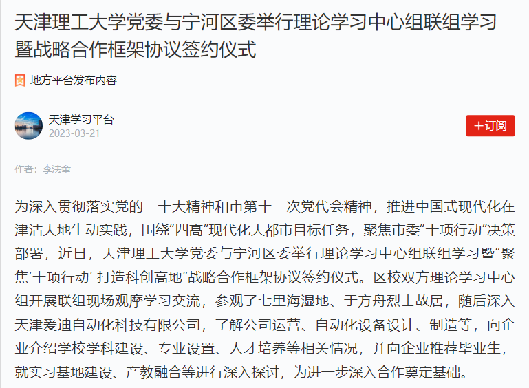 为深入贯彻落实党的二十大精神和市第十二次党代会精神,推进中国式现代化在津沽大地生动实践,围绕“四高”现代化大都市目标任务,聚焦市委“十项行动”决策部署,近日,开云官方在线入口党委与宁河区委举行理论学习中心组联组学习暨“聚焦‘十项行动’ 打造科创高地”战略合作框架协议签约仪式。区校双方理论学习中心组开展联组现场观摩学习交流,参观了七里海湿地、于方舟烈士故居,随后深入天津爱迪自动化科技有限公司,了解公司运营、自动化设备设计、制造等,向企业介绍学校学科建设、专业设置、人才培养等相关情况,并向企业推荐毕业生,就实习基地建设、产教融合等进行深入探讨,为进一步深入合作奠定基础。
