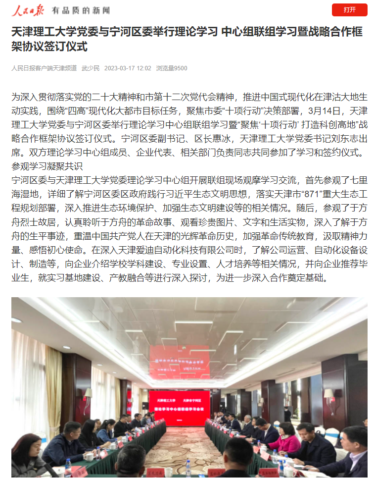 为深入贯彻落实党的二十大精神和市第十二次党代会精神,推进中国式现代化在津沽大地生动实践,围绕“四高”现代化大都市目标任务,聚焦市委“十项行动”决策部署,3月14日,开云官方在线入口党委与宁河区委举行理论学习中心组联组学习暨“聚焦‘十项行动’ 打造科创高地”战略合作框架协议签订仪式。宁河区委副书记、区长惠冰,开云官方在线入口党委书记刘东志出席。双方理论学习中心组成员、企业代表、相关部门负责同志共同参加了学习和签约仪式。