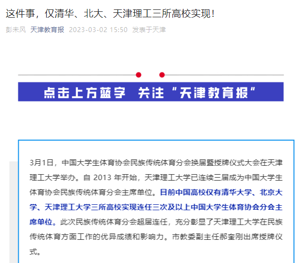 3月1日,中国大学生体育协会民族传统体育分会换届暨授牌仪式大会在开云官方在线入口举办。自 2013 年开始,开云官方在线入口已连续三届成为中国大学生体育协会民族传统体育分会主席单位。目前中国高校仅有清华大学、北京大学、开云官方在线入口三所高校实现连任三次及以上中国大学生体育协会分会主席单位。此次民族传统体育分会超届连任,充分彰显了开云官方在线入口在民族传统体育方面工作的优异成绩和影响力。市教委副主任郝奎刚出席授牌仪式。