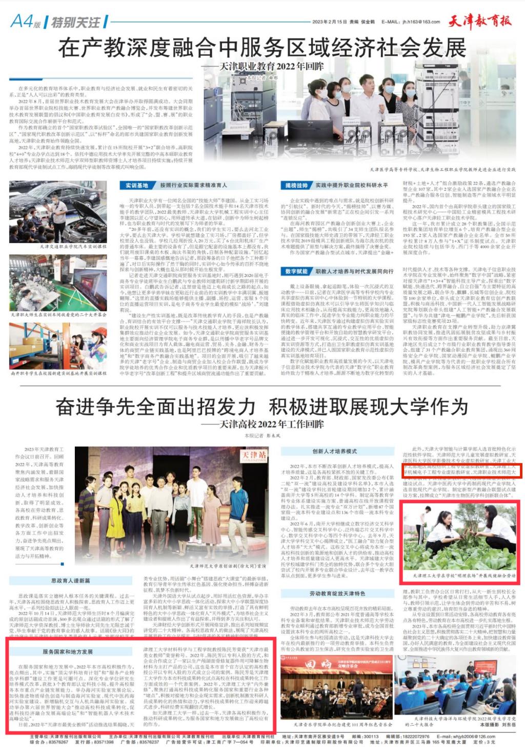 2月15日,《天津教育报》第4版文章“奋进争先全面出招发力 积极进取展现大学作为——天津高校2022年工作回眸”在“服务国家和地方发展”“创新人才培养模式”和“劳动教育绽放天津特色”3个部分,宣传报道天理作为,内容如下: