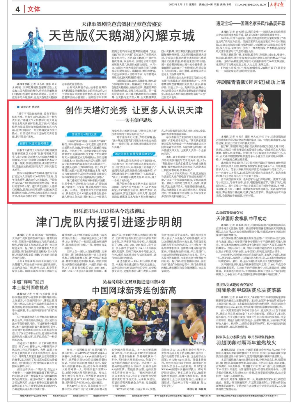 2月12日,《天津日报》第4版以《创作天塔灯光秀 让更多人认识天津》为题,刊发对我校艺术学院青年教师卢思屹的专访文章,他的作品《“你好,天津”天塔跨年灯光表演迎接2022》入围“你好,天津”网络短视频大赛一等奖获奖作品公示名单,内容如下: