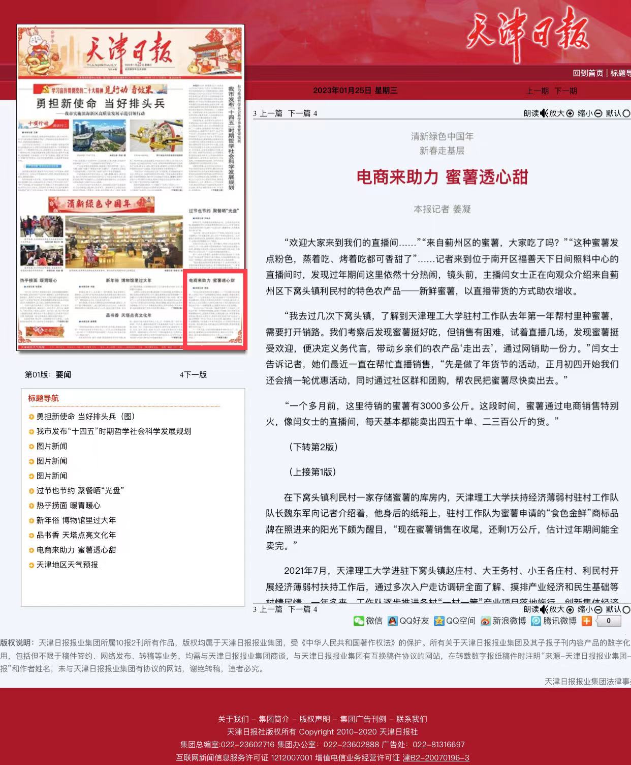 1月25日癸卯年正月初四,《天津日报》头版“清新绿色中国年 新春走基层”栏目,刊发我校派驻蓟州区下窝头镇扶持经济薄弱村驻村工作队,推动各村“一村一策”产业项目落地施行,创新集体经济发展思路和模式,拓宽农作物销售渠道助农增收的先进经验,内容如下: