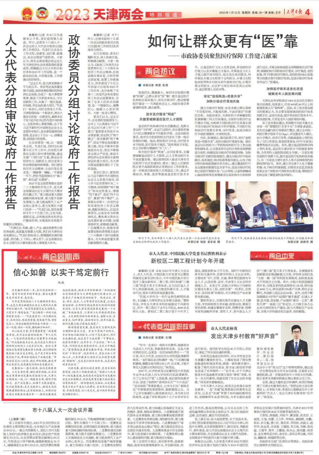 1月12日,《天津日报》第4版“2023天津两会特别报道”专版刊发采访市政协委员、我校电气工程与自动化学院教授周雪松的文章“信心如磐 以实干笃定前行”,周雪松教授建议以创新驱动纵深推进京津冀协同发展,加快优势互补,促进要素优化配置,打造从原始创新、应用研究到成果转换的协同创新共同体,内容如下: