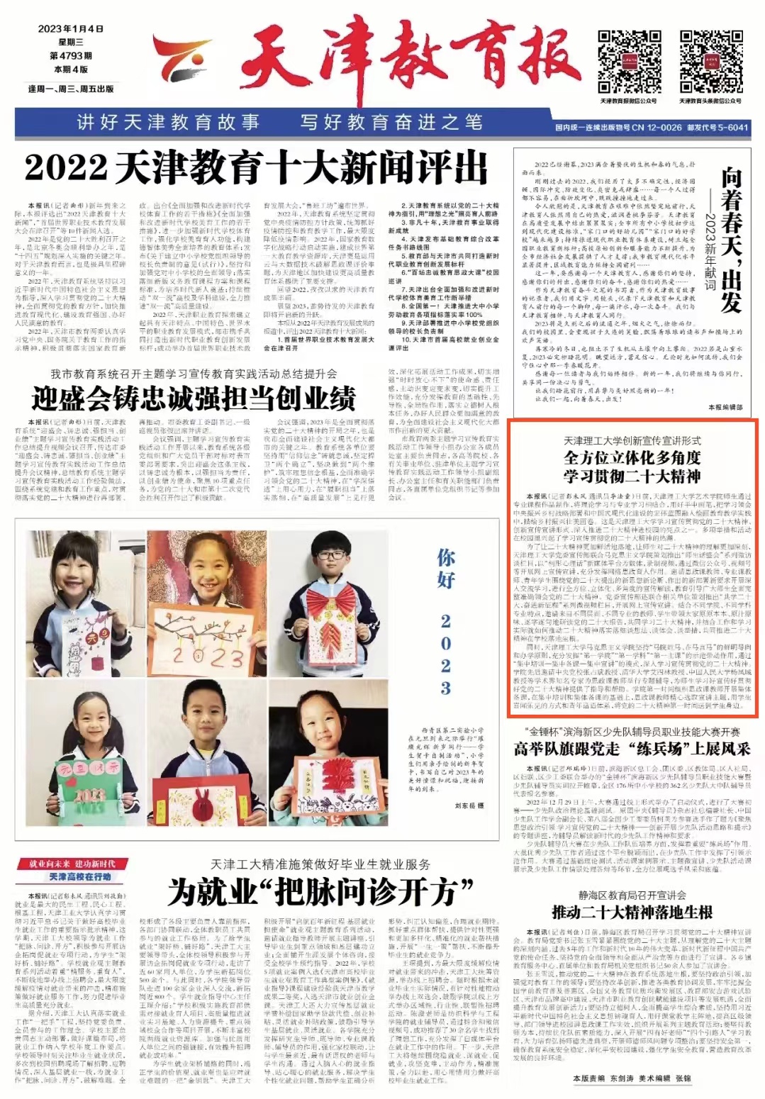 1月4日,《天津教育报》在头版报道我校创新宣传宣讲形式,全方位、立体化、多角度学习宣传贯彻党的二十大精神,推动党的二十大精神在校园落地生根,内容如下: