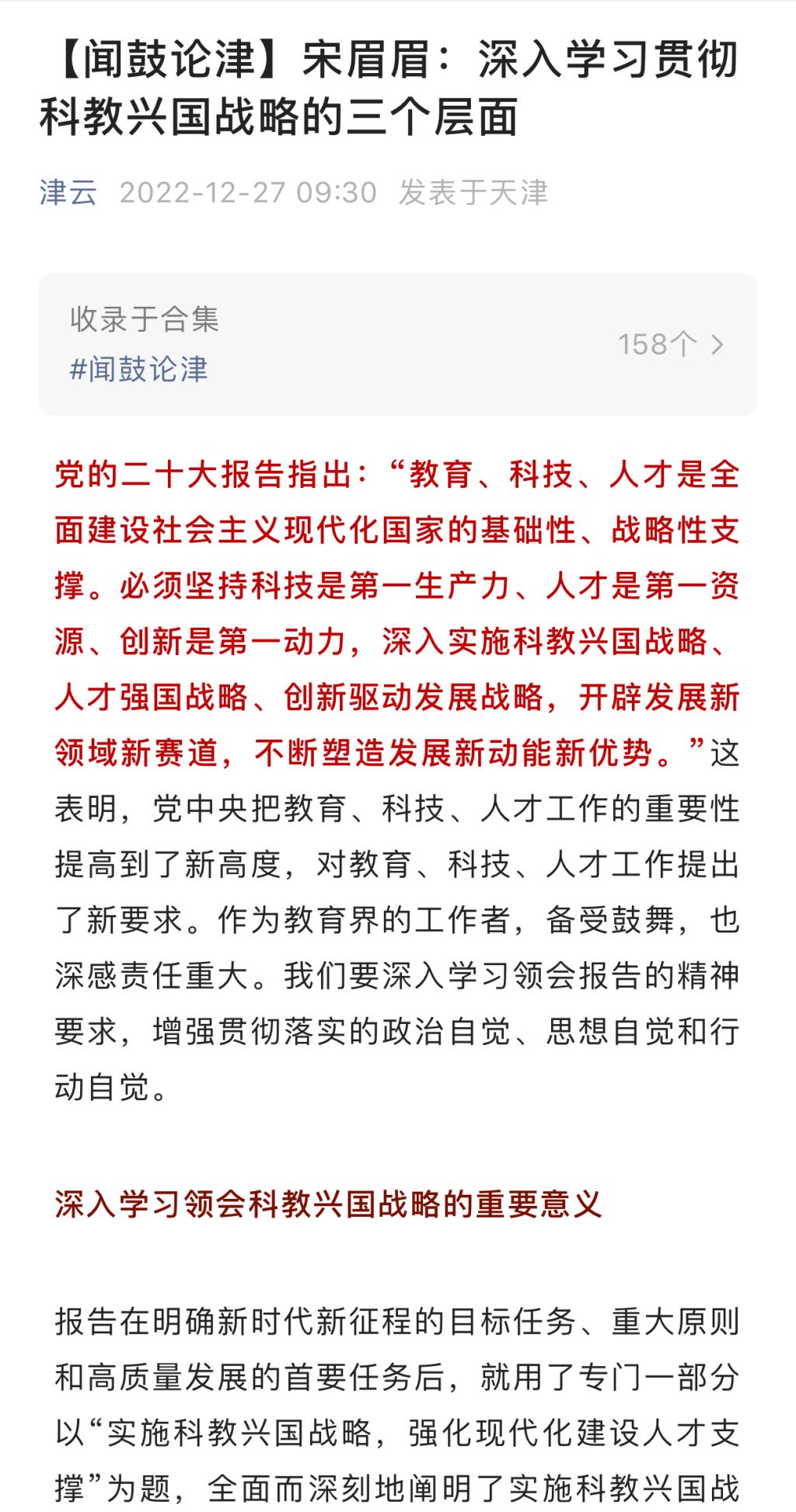 12月27日,我校理学院院长、教授宋眉眉作客津云“闻鼓论津”栏目,以“深入学习贯彻科教兴国战略的三个层面”为题谈深入学习领会党的二十大报告的体会,内容如下: