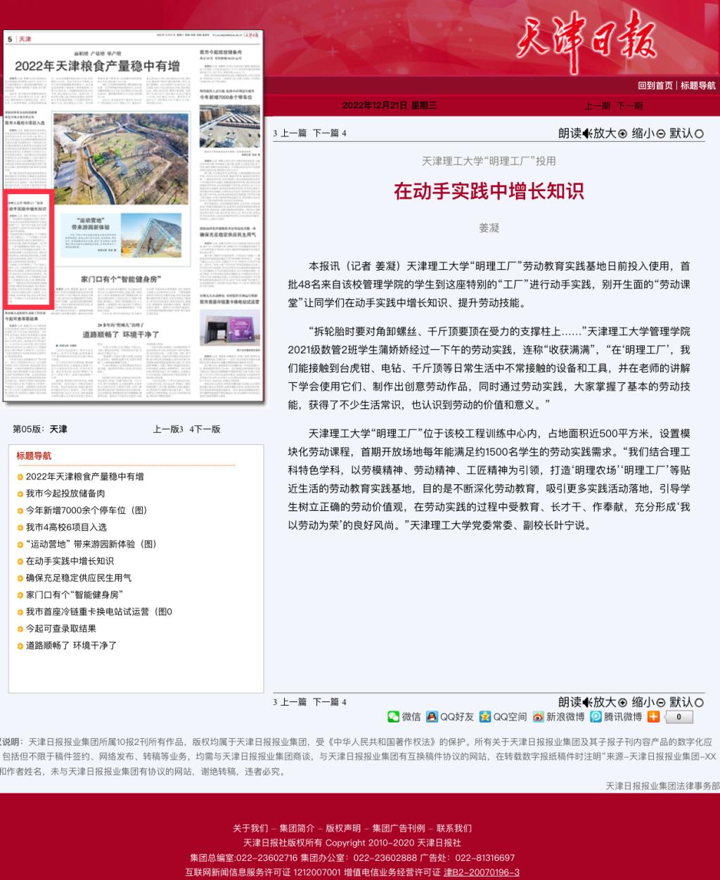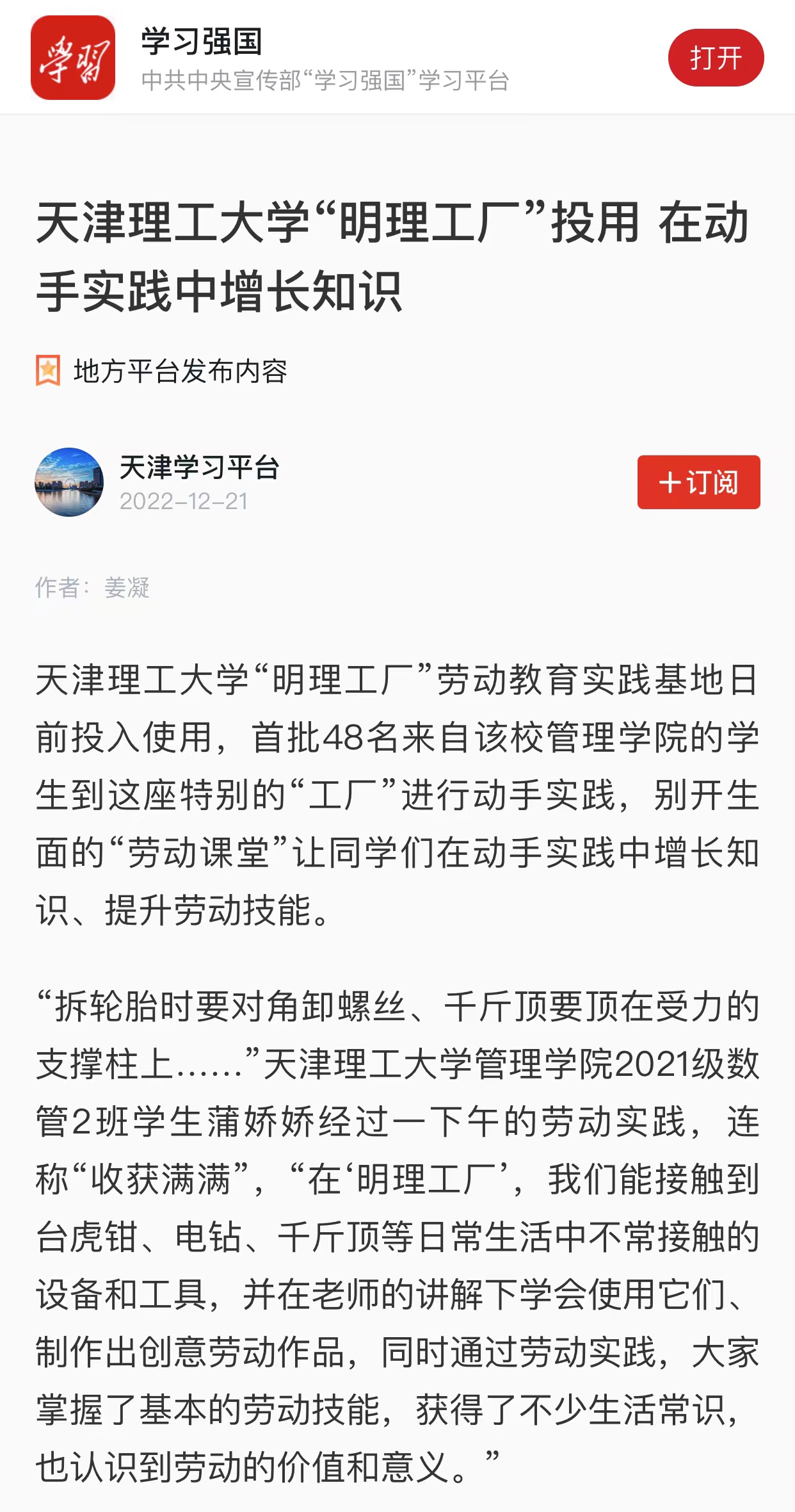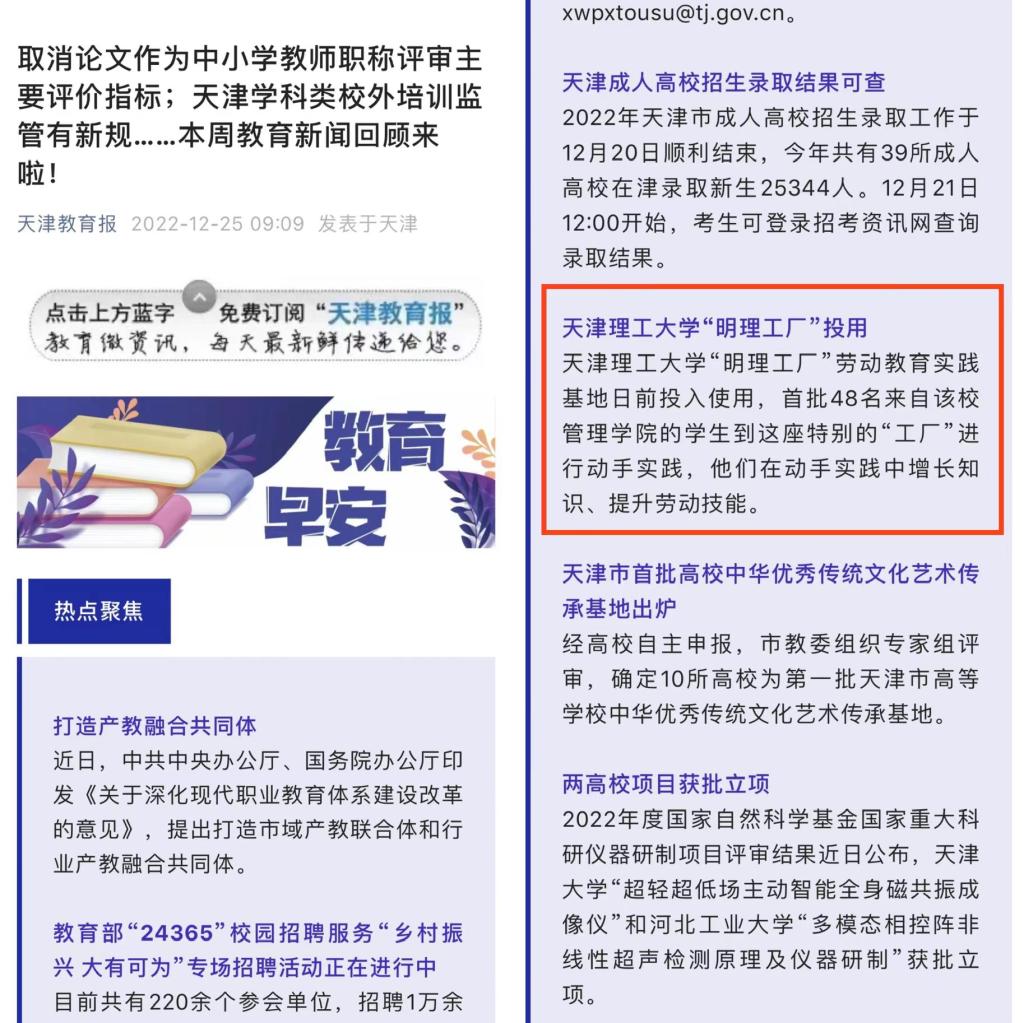 日前,学习强国、新华网、《天津日报》、北方网、天津政务网,天津教育报、天津广播微信公众号和津门教育微博等众多媒体先后关注报道我校“明理工厂”劳动教育实践基地投入使用,开设不锈钢艺术卡片制作、防腐木花箱制作、汽车轮胎更换等科目,打造学生劳动教育实践平台,引导学生树立正确的劳动价值观,在劳动实践的过程中受教育、长才干、作奉献的先进经验,内容如下: