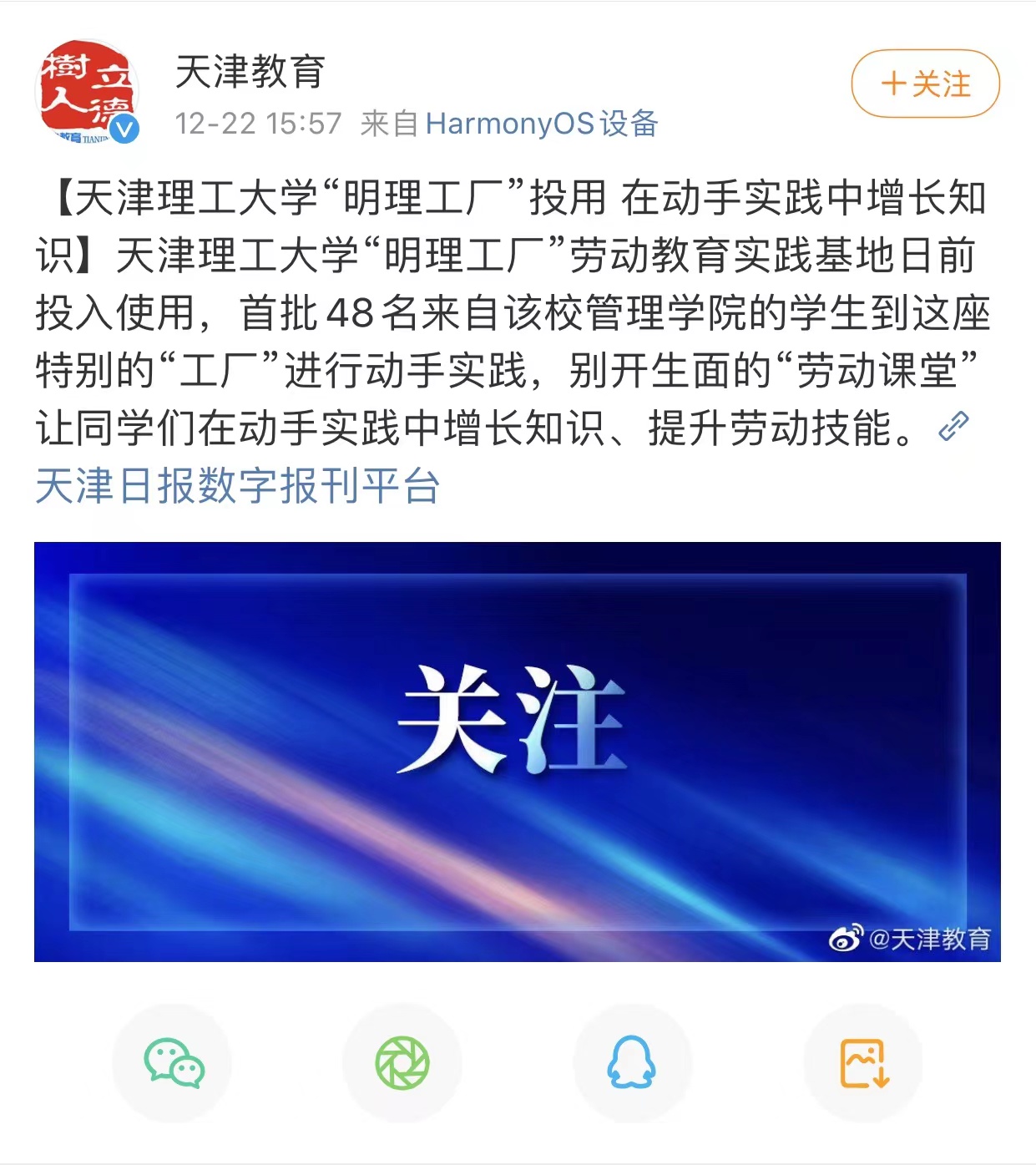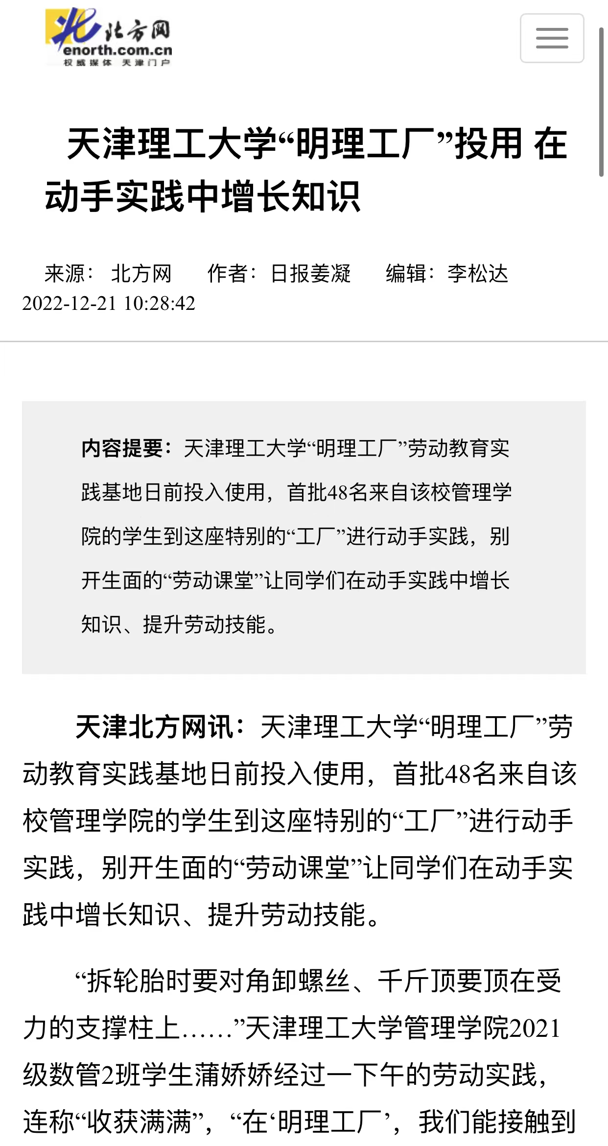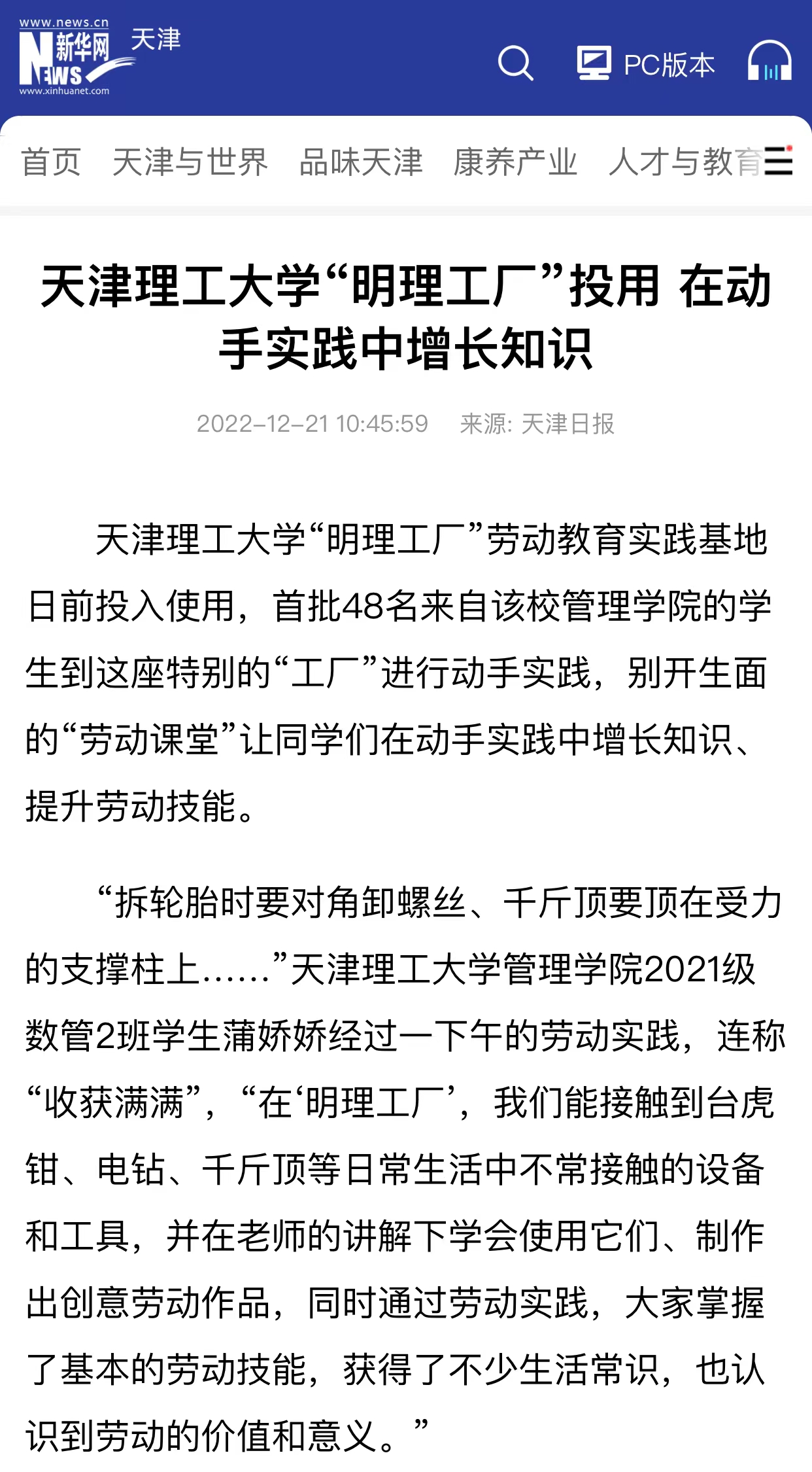 日前,学习强国、新华网、《天津日报》、北方网、天津政务网,天津教育报、天津广播微信公众号和津门教育微博等众多媒体先后关注报道我校“明理工厂”劳动教育实践基地投入使用,开设不锈钢艺术卡片制作、防腐木花箱制作、汽车轮胎更换等科目,打造学生劳动教育实践平台,引导学生树立正确的劳动价值观,在劳动实践的过程中受教育、长才干、作奉献的先进经验,内容如下: