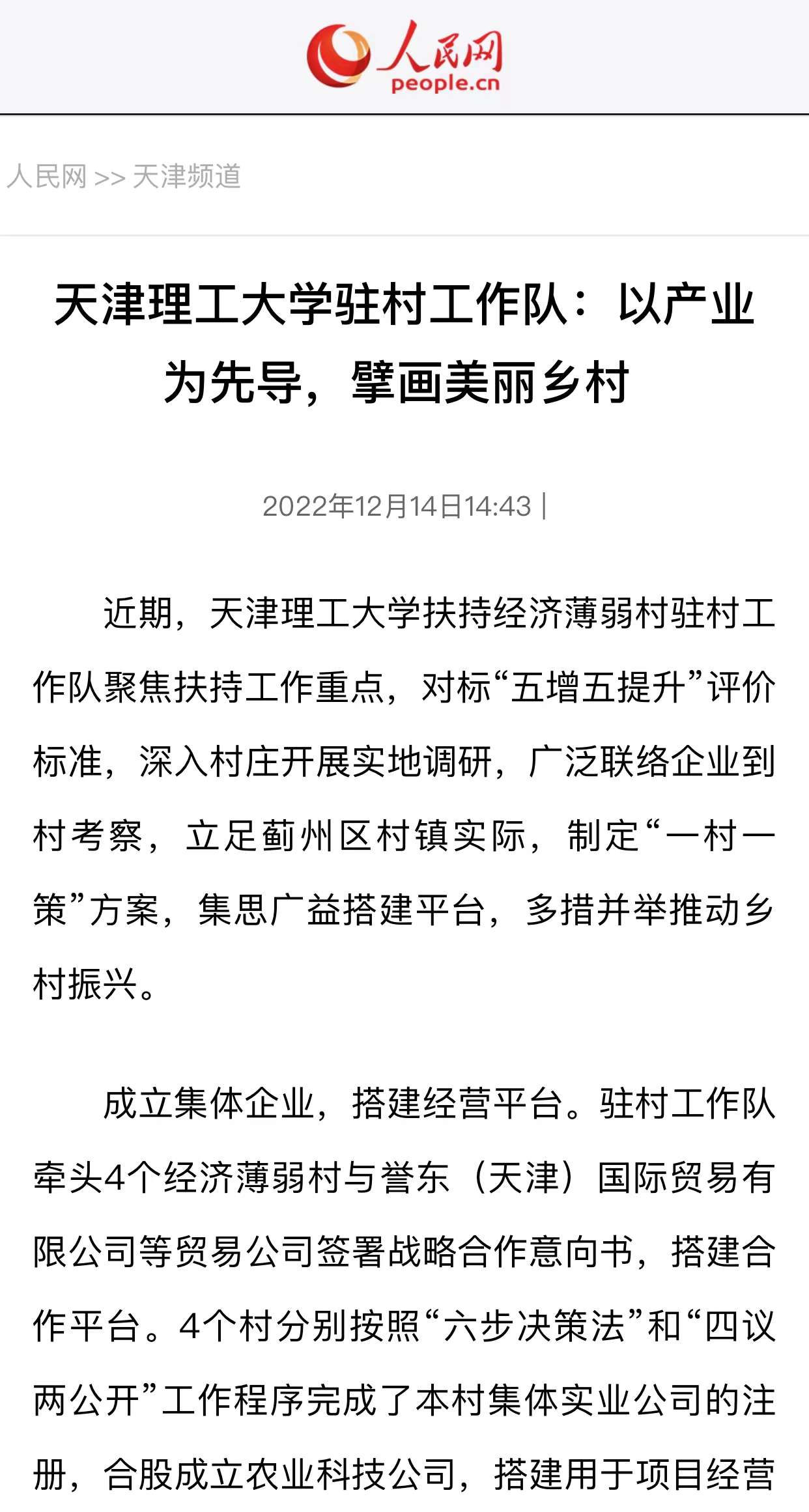 12月14日,人民网关注报道我校派驻蓟州区下窝头镇扶持经济薄弱村驻村工作队,聚焦扶持工作重点,对标“五增五提升”评价标准,深入村庄开展实地调研,广泛联络企业到村考察,立足蓟州区村镇实际,制定“一村一策”方案,集思广益搭建平台,多措并举推动乡村振兴的先进事迹,内容如下:
