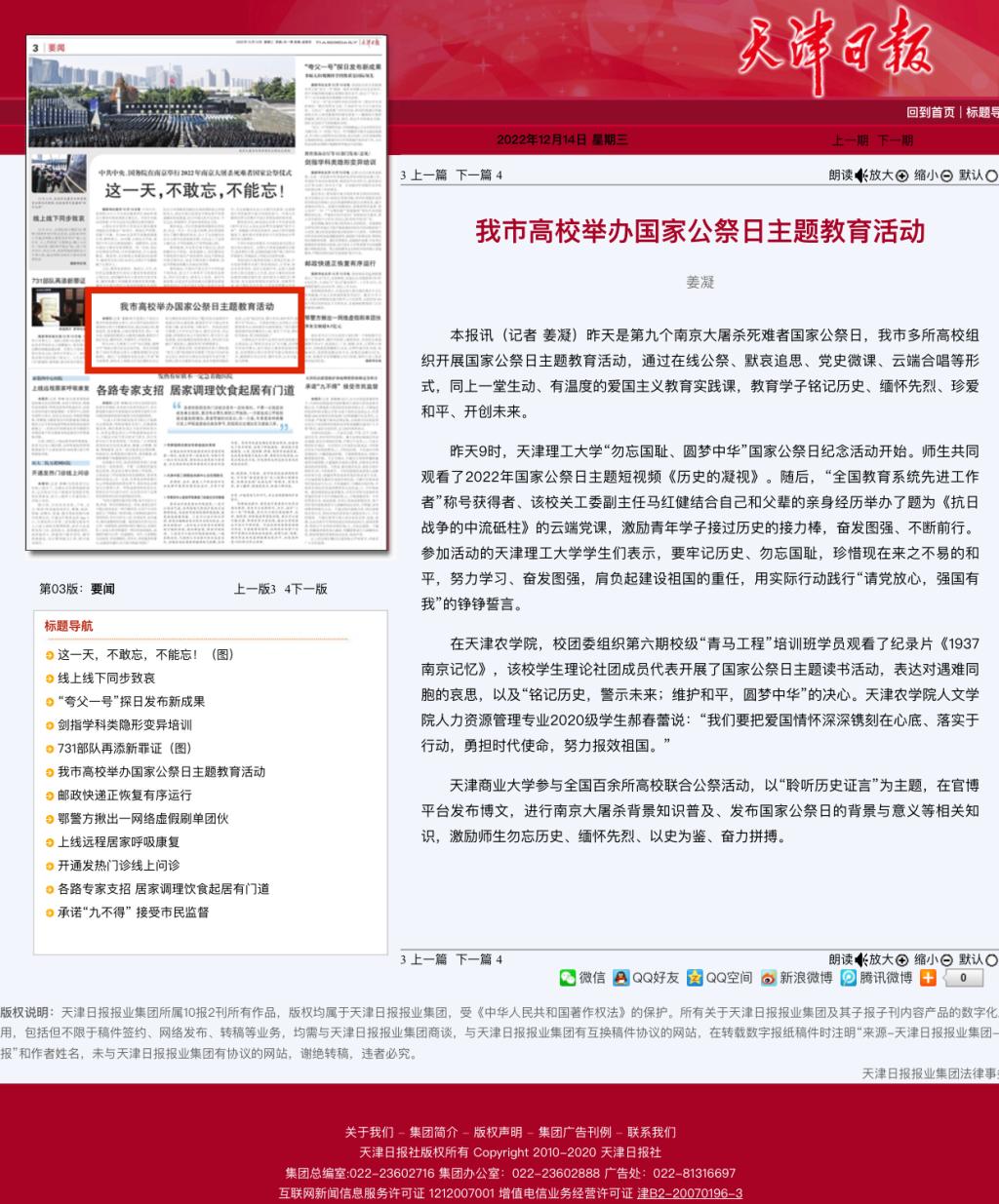 12月14日,《天津日报》在第3版报道我校开展“勿忘国耻、圆梦中华”国家公祭日纪念活动,“全国教育系统先进工作者”称号获得者、关工委副主任马红健结合自己和父辈的亲身经历举办题为《抗日战争的中流砥柱》的云端党课,激励青年学子接过历史的接力棒,奋发图强、不断前行,内容如下: