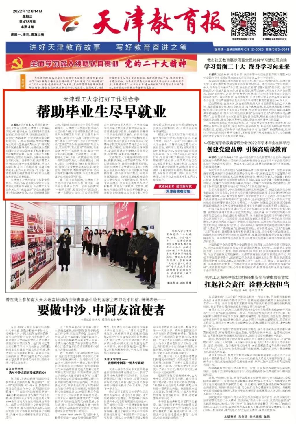 12月14日,《天津教育报》在头版“‘就业向未来 建功新时代’天津高校在行动”专栏,开栏首篇报道我校打好工作组合拳,助力应届毕业生高质量充分就业的有力举措和特色招法,内容如下: