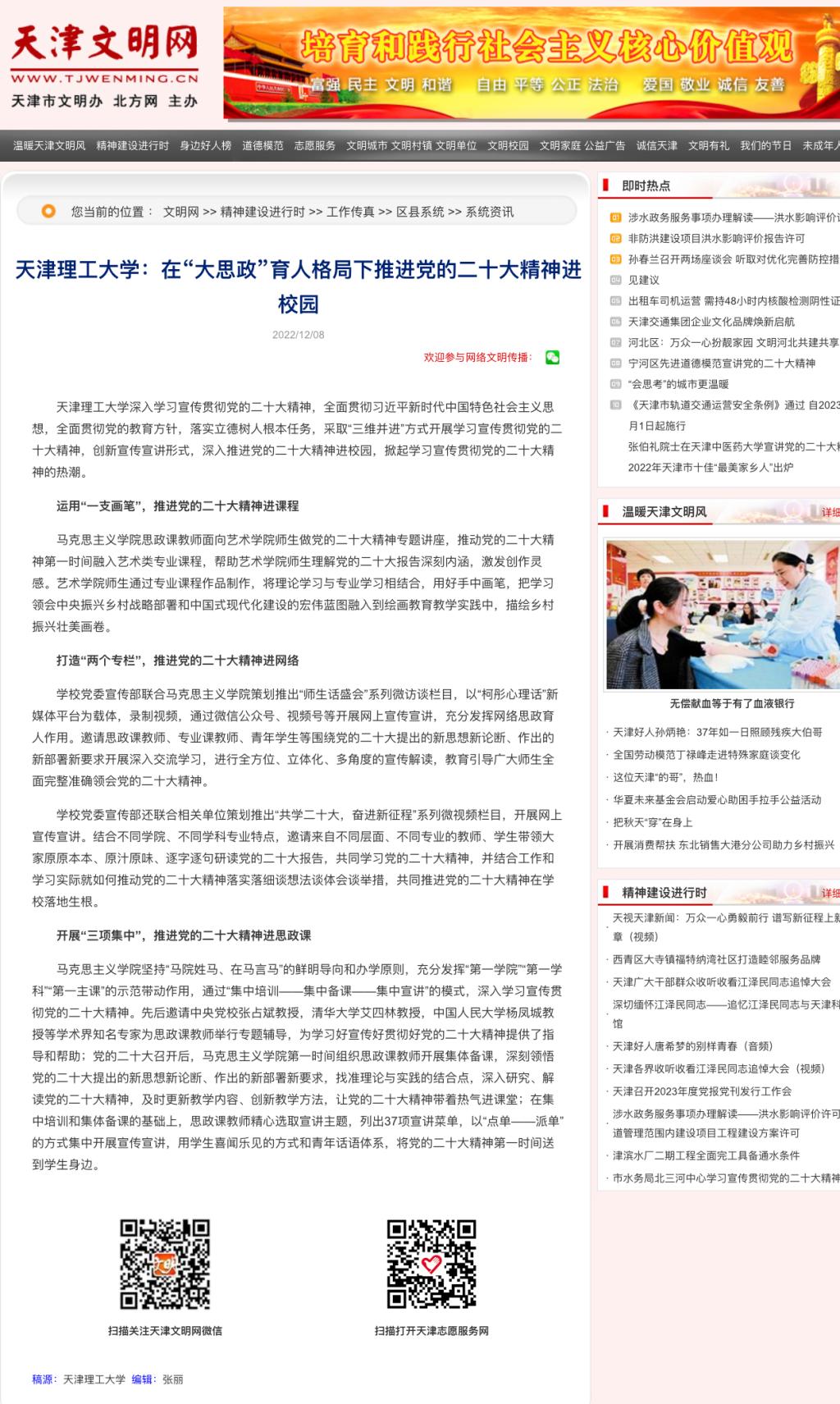 12月8日,天津文明网报道我校深入学习宣传贯彻党的二十大精神,全面贯彻习近平新时代中国特色社会主义思想,全面贯彻党的教育方针,落实立德树人根本任务,采取“三维并进”方式开展学习宣传贯彻党的二十大精神,创新宣传宣讲形式,深入推进党的二十大精神进校园,内容如下: