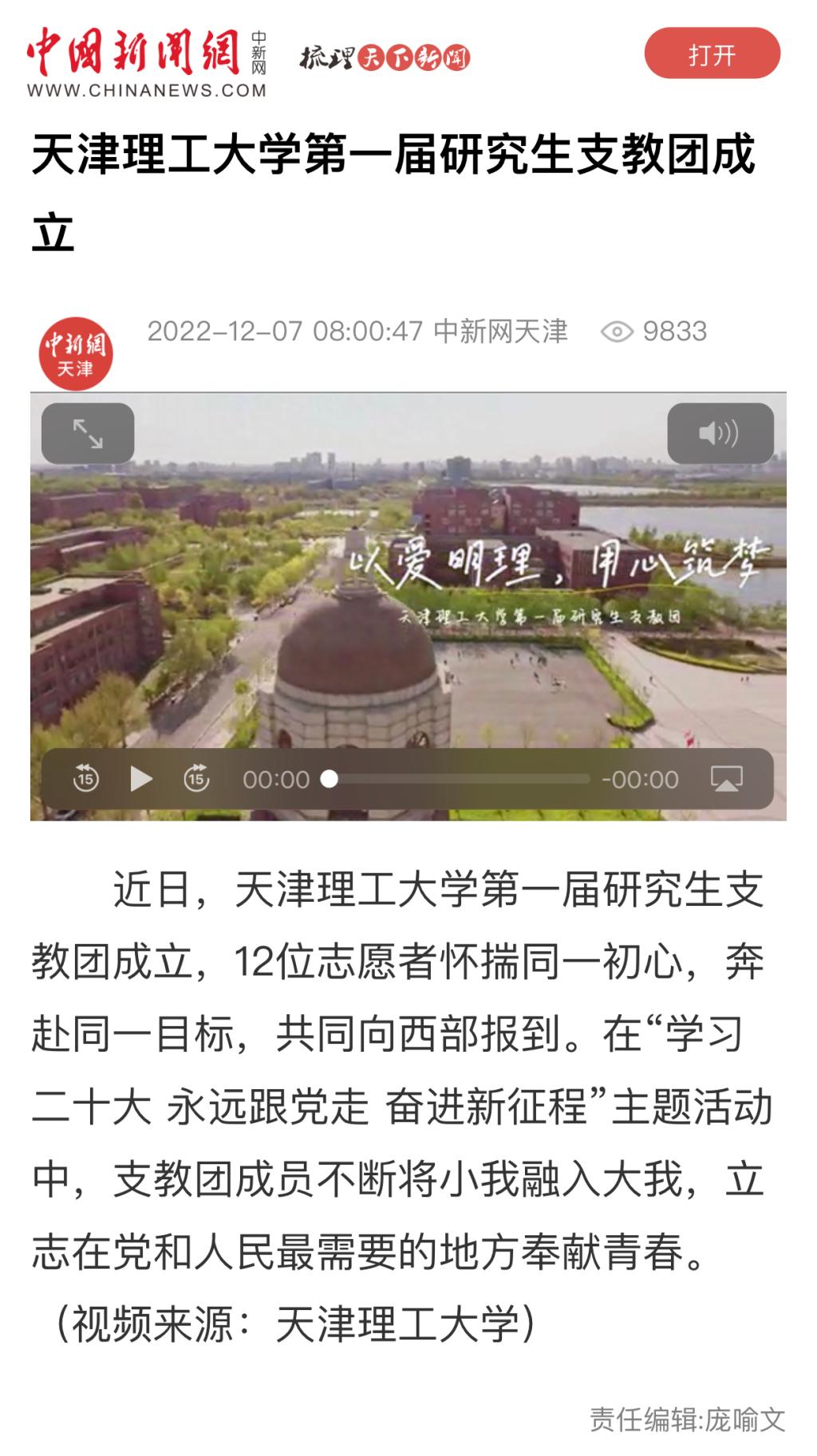 12月7日,中国新闻网以视频和文字的方式报道我校第一届研究生支教团成立,12位志愿者怀揣同一初心,奔赴同一目标,共同向西部报到,立志在党和人民最需要的地方奉献青春,内容如下: