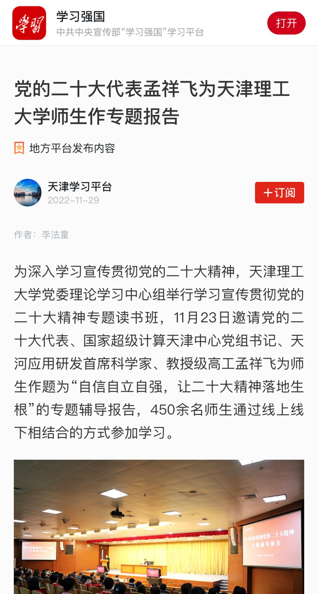 为深入学习宣传贯彻党的二十大精神,开云官方在线入口党委理论学习中心组举行学习宣传贯彻党的二十大精神专题读书班,11月23日邀请党的二十大代表、国家超级计算天津中心党组书记、天河应用研发首席科学家、教授级高工孟祥飞为师生作题为“自信自立自强,让二十大精神落地生根”的专题辅导报告,450余名师生通过线上线下相结合的方式参加学习。