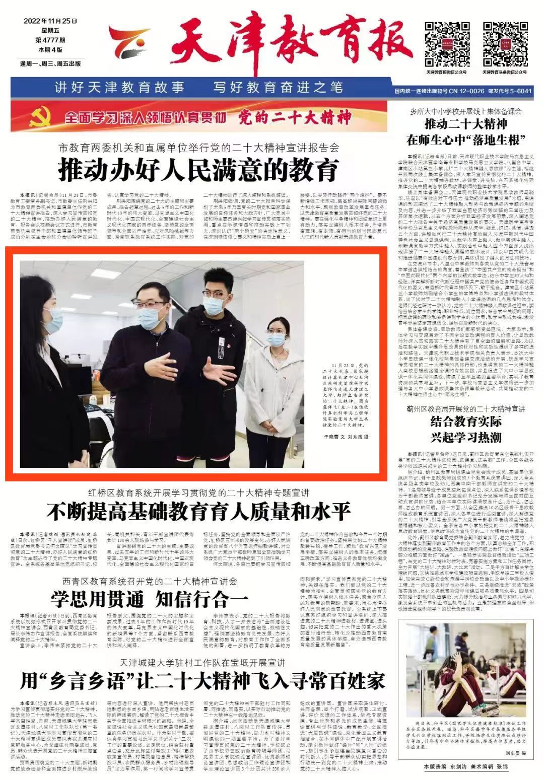 11月25日,《天津教育报》在头版以图文方式报道党的二十大代表、国家超级计算天津中心天河应用研发首席科学家孟祥飞走进我校,向师生宣讲党的二十大精神情况,内容如下: