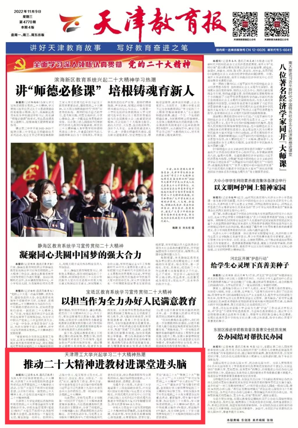 11月9日,《天津教育报》在头版报道我校兴起学习二十大精神热潮,推动二十大精神进教材进课堂进头脑,内容如下: