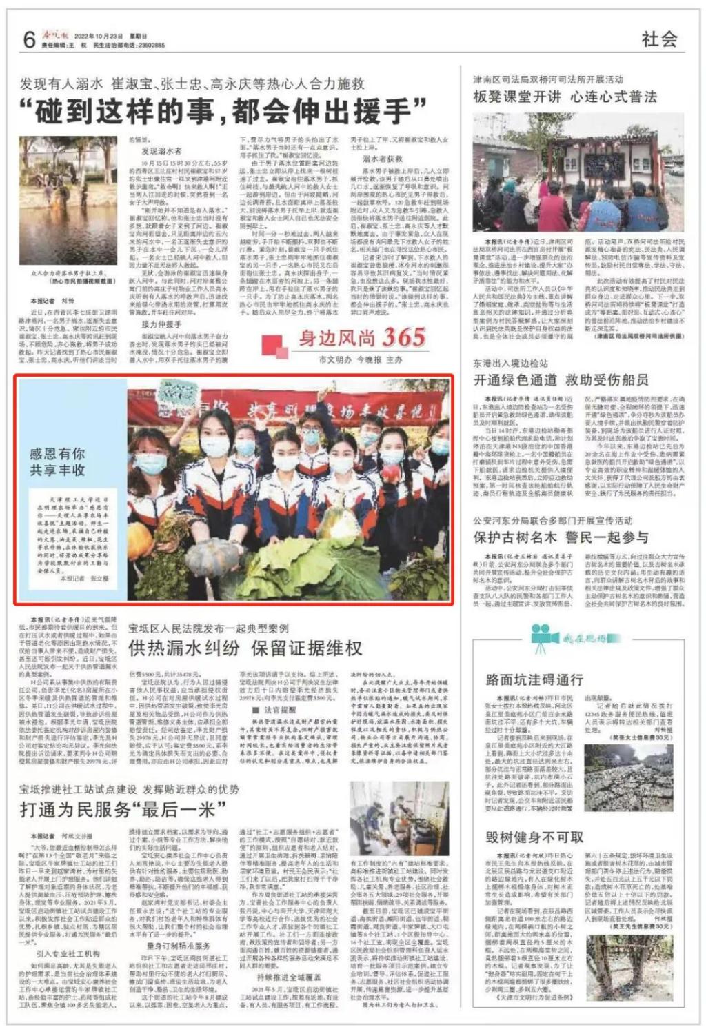 10月23日,《今晚报》第六版报道我校近日在明理农场举办“感恩有你——天理人共享农场丰收喜悦”主题活动,师生一起走进农场采摘自己种植的大葱、油麦菜、辣椒、花生等农作物,在体验收获快乐的同时,将劳动成果分享给为学校默默付出的工勤与安保人员,内容如下: