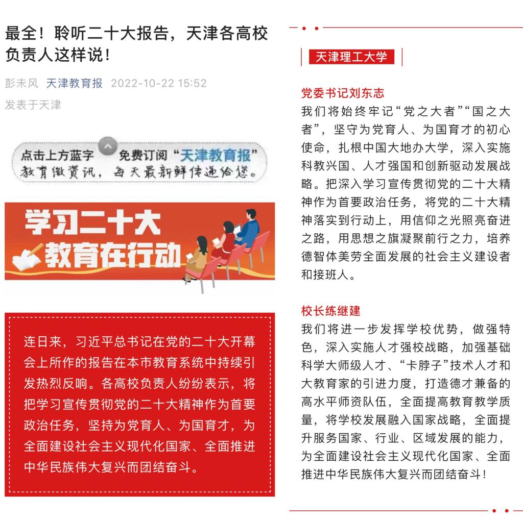 10月22日,天津教育报刊发我校党委书记刘东志、校长练继建热议党的二十大报告情况,内容如下: