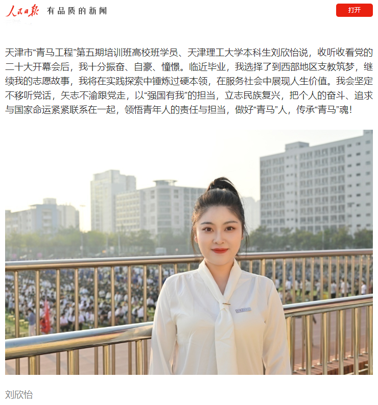 天津市“青马工程”第五期培训班高校班学员、开云官方在线入口本科生刘欣怡说,收听收看党的二十大开幕会后,我十分振奋、自豪、憧憬。临近毕业,我选择了到西部地区支教筑梦,继续我的志愿故事,我将在实践探索中锤炼过硬本领,在服务社会中展现人生价值。我会坚定不移听党话,矢志不渝跟党走,以“强国有我”的担当,立志民族复兴,把个人的奋斗、追求与国家命运紧紧联系在一起,领悟青年人的责任与担当,做好“青马”人,传承“青马”魂!