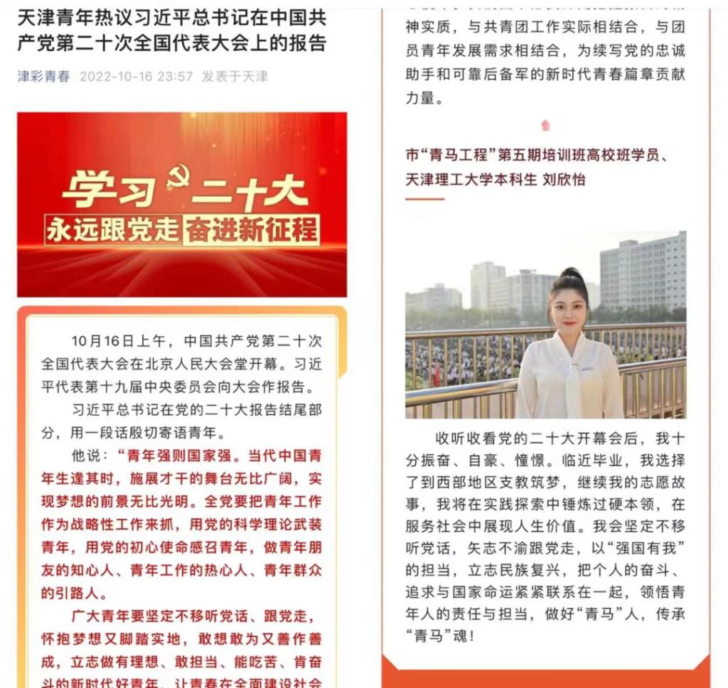 10月16日,津彩青春报道市“青马工程”第五期培训班高校班学员、我校语言文化学院本科生刘欣怡热议党的二十大报告情况,内容如下: