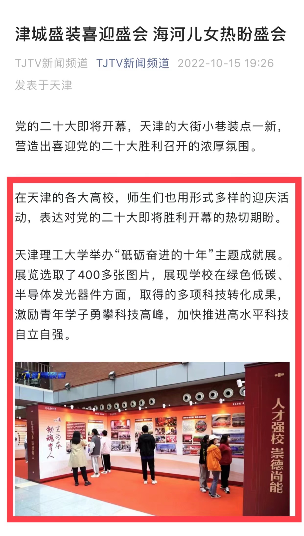 金秋逢盛会,豪情绘华章。在党的二十大胜利召开前夕,天津电视台《天津新闻》、TJTV新闻频道客户端报道我校广大师生参观学校事业发展成就展,观看党的十八大以来学校在绿色低碳、半导体发光器件等方面取得的丰硕成果,激励青年学子勇攀科技高峰,加快推进高水平科技自立自强。同时报道了我校新能源材料与低碳技术研究院师生开展科研攻关,致力于推动实现碳中和国家重大战略目标的生动场景,充分展现天理师生热切期盼党的二十大胜利召开的激动心情,以实干实绩向党的二十大献礼, 内容如下: