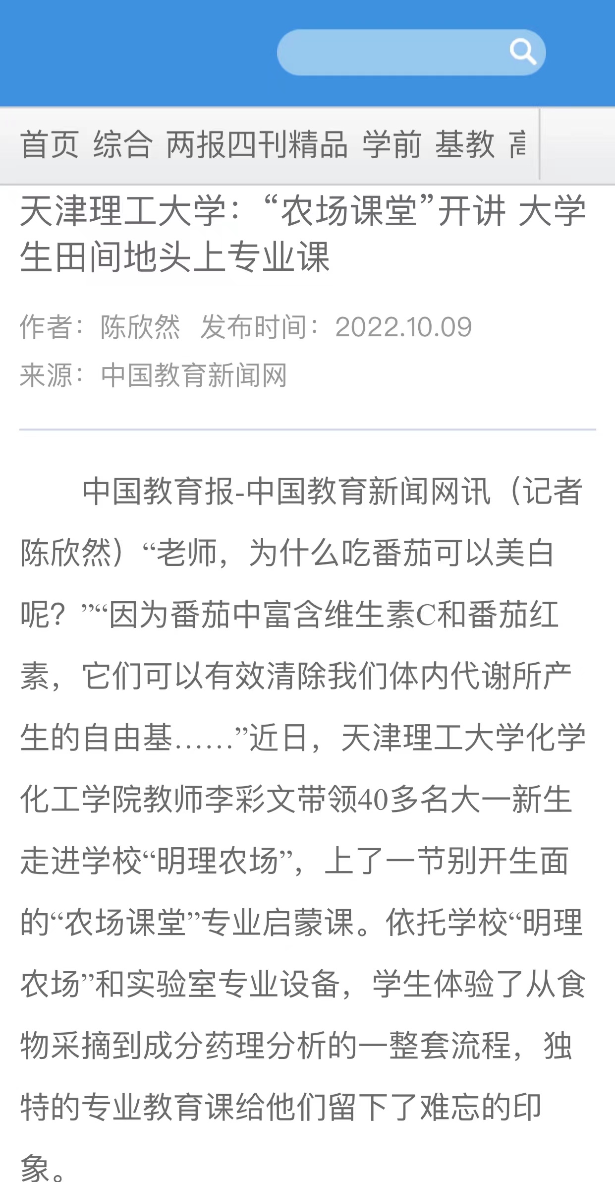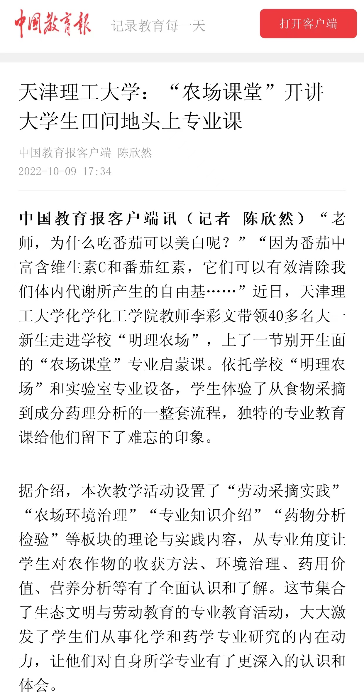 据介绍,本次教学活动设置了“劳动采摘实践”“农场环境治理”“专业知识介绍”“药物分析检验”等板块的理论与实践内容,从专业角度让学生对农作物的收获方法、环境治理、药用价值、营养分析等有了全面认识和了解。这节集合了生态文明与劳动教育的专业教育活动,大大激发了学生们从事化学和药学专业研究的内在动力,让他们对自身所学专业有了更深入的认识和体会。