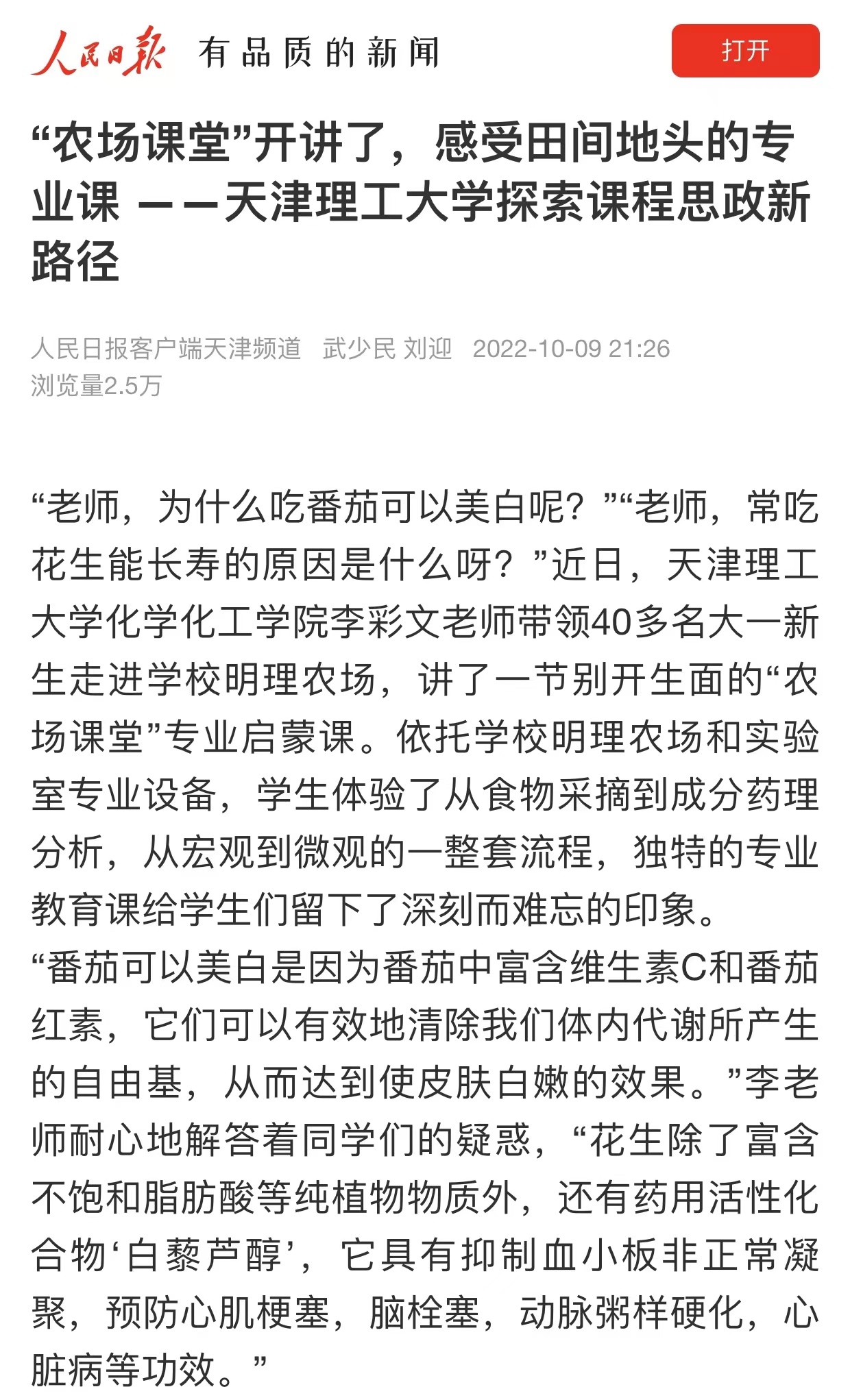 “老师,为什么吃番茄可以美白呢?”“老师,常吃花生能长寿的原因是什么呀?”近日,开云官方在线入口化学化工学院李彩文老师带领40多名大一新生走进学校明理农场,讲了一节别开生面的“农场课堂”专业启蒙课。依托学校明理农场和实验室专业设备,学生体验了从食物采摘到成分药理分析,从宏观到微观的一整套流程,独特的专业教育课给学生们留下了深刻而难忘的印象。
