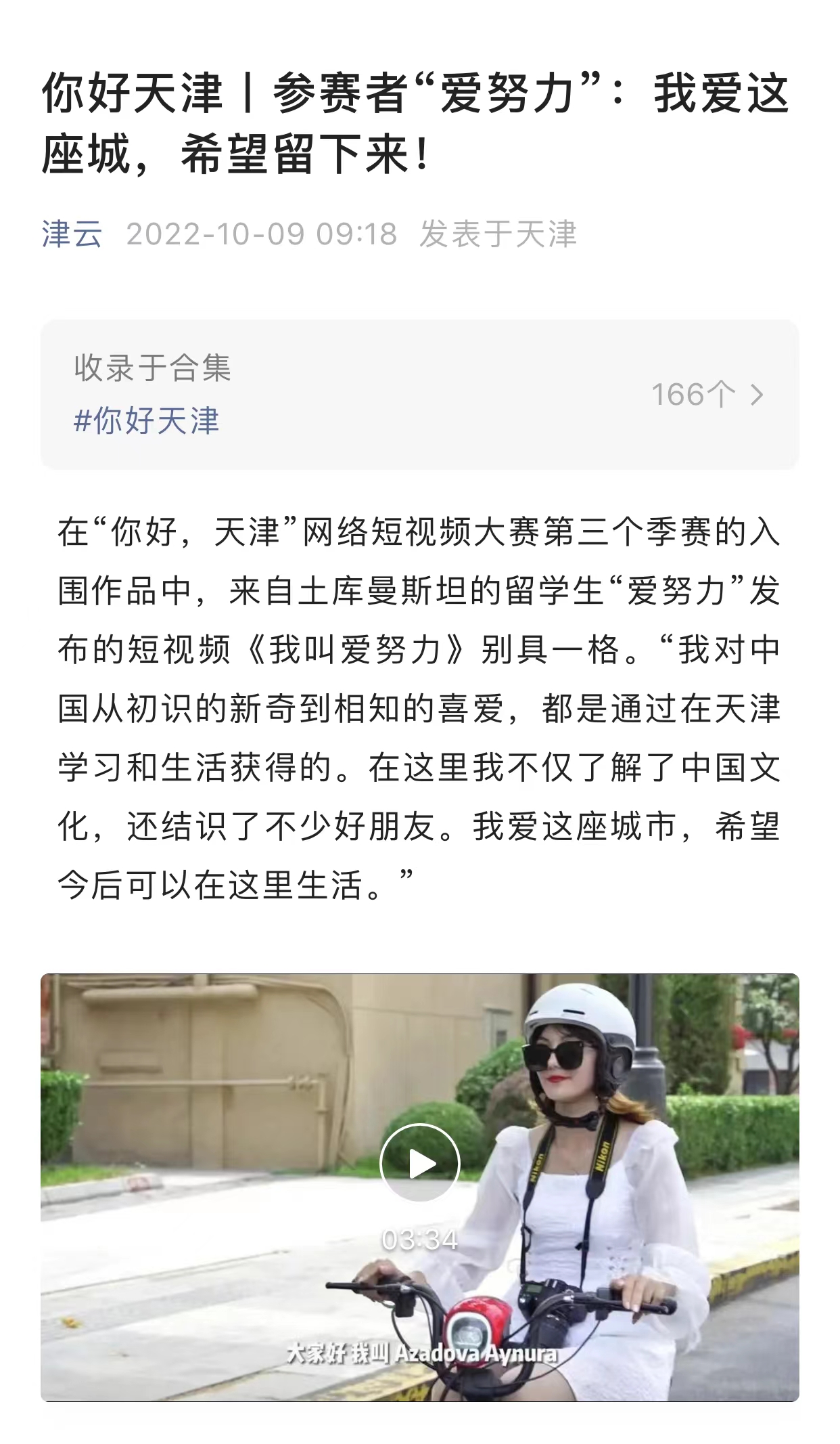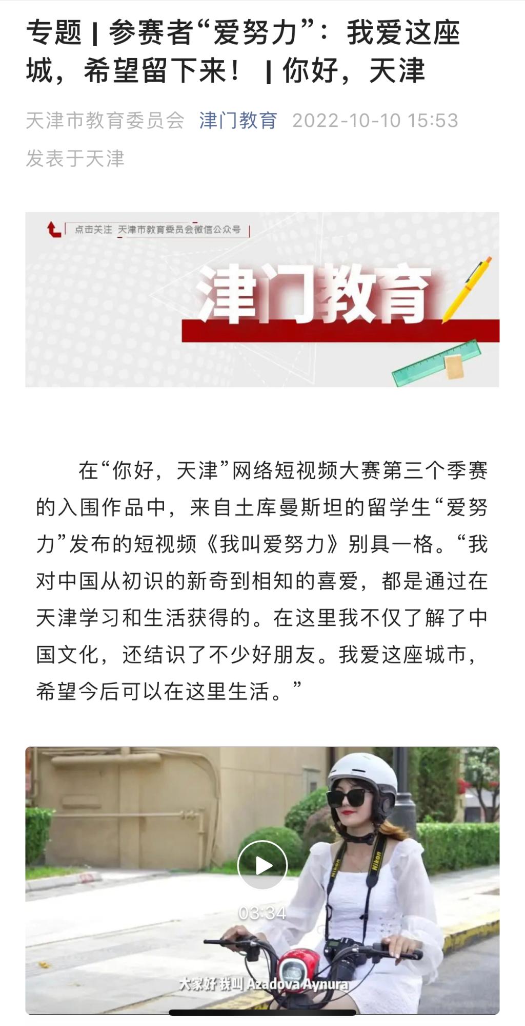 在“你好,天津”网络短视频大赛第三个季赛的入围作品中,来自土库曼斯坦的留学生“爱努力”发布的短视频《我叫爱努力》别具一格。“我对中国从初识的新奇到相知的喜爱,都是通过在天津学习和生活获得的。在这里我不仅了解了中国文化,还结识了不少好朋友。我爱这座城市,希望今后可以在这里生活。”