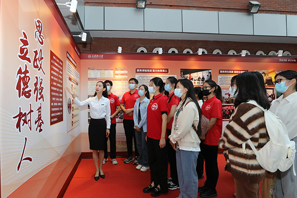 讲解员为参观展览的学生讲解党的十八大以来学校聚焦立德树人根本任务构建“大思政”育人格局