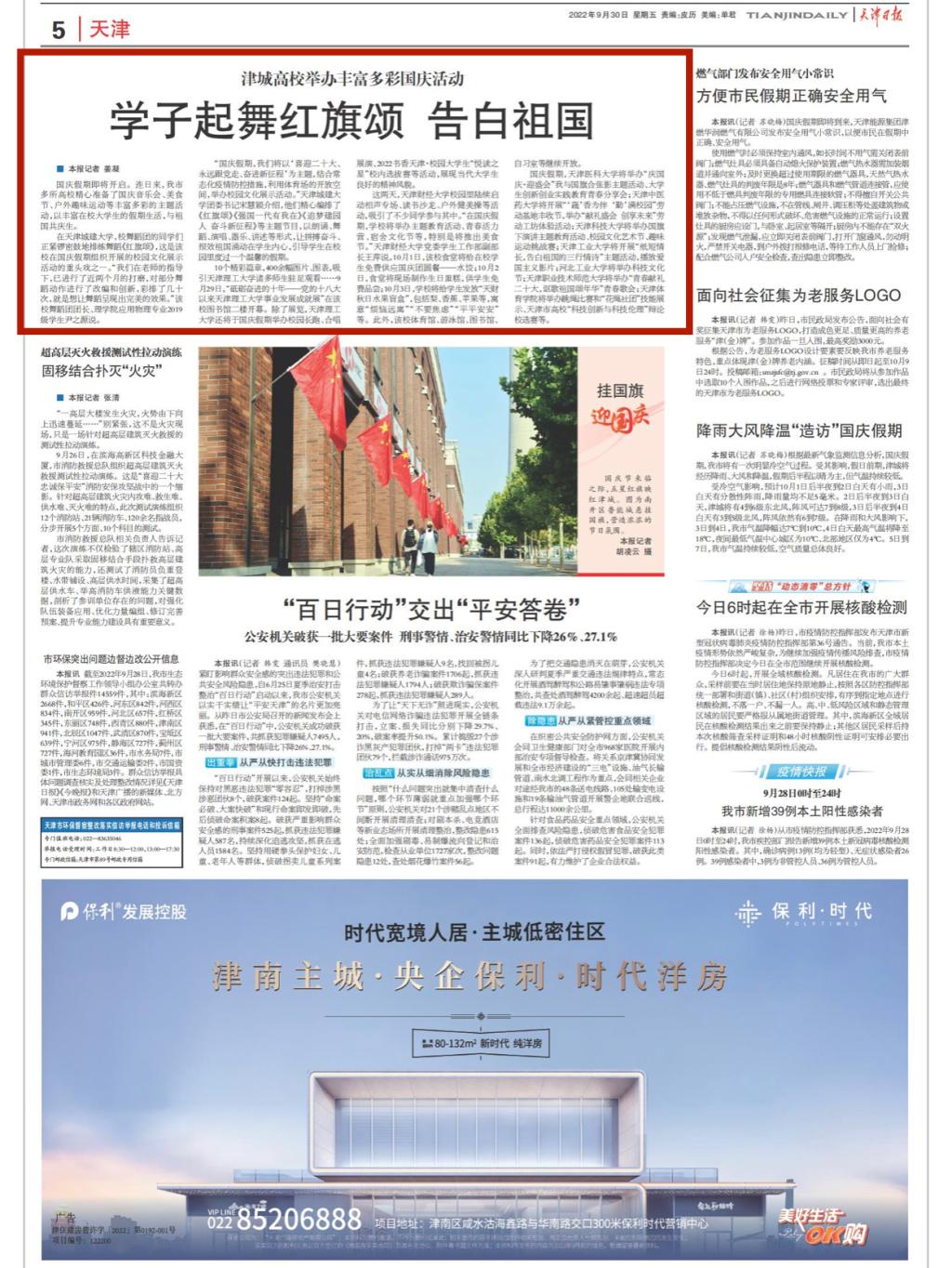 9月30日,《天津日报》第5版报道我校为庆祝中华人民共和国成立73周年,丰富广大师生课余文化生活,举办一系列丰富多彩的活动,内容如下: