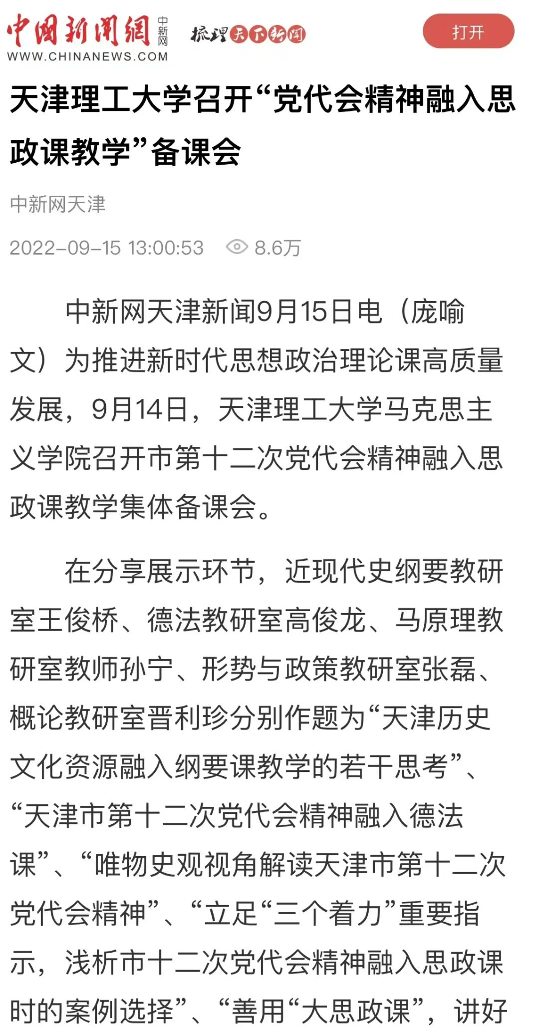 9月14日,中国新闻网报道我校马克思主义学院召开市第十二次党代会精神融入思政课教学集体备课会,推进新时代思想理论课高质量发展的情况,内容如下: