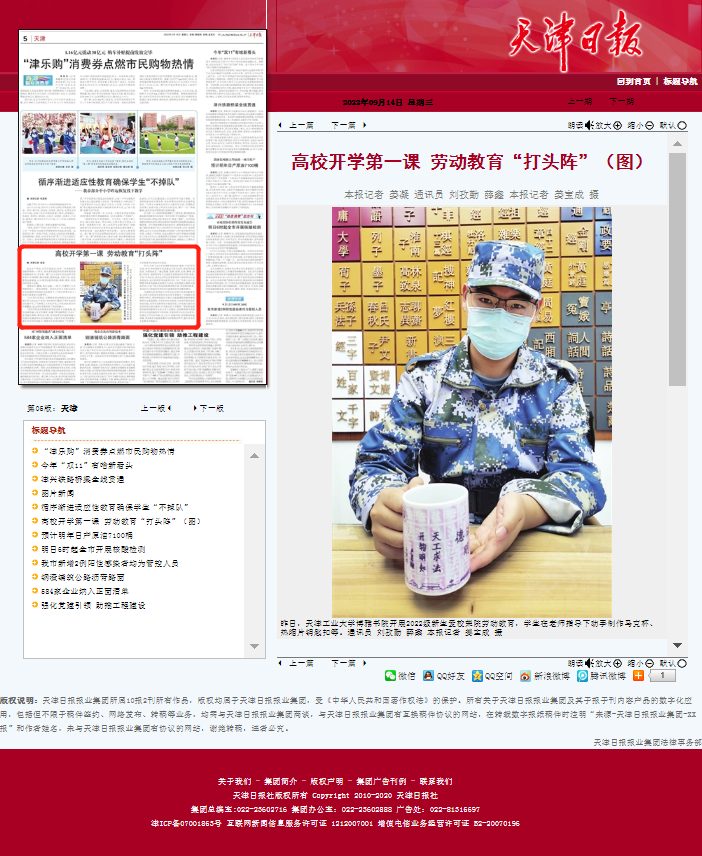 9月14日,《天津日报》在第5版报道我校依托明理农场等劳动育人实践基地开展劳动实践教育,给2022级新生上好开学第一课,内容如下: