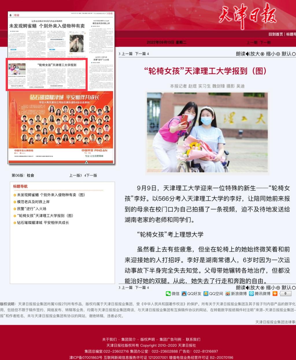 李好向记者介绍:“接到录取通知书后我特别兴奋,与学校沟通了几次。老师了解到我的情况后,主动提出帮助,并详细介绍了学校的无障碍设施。我报考的软件工程专业在全国排名相当靠前。而天津气候宜人,充满活力,就业机会多,医疗条件好。”