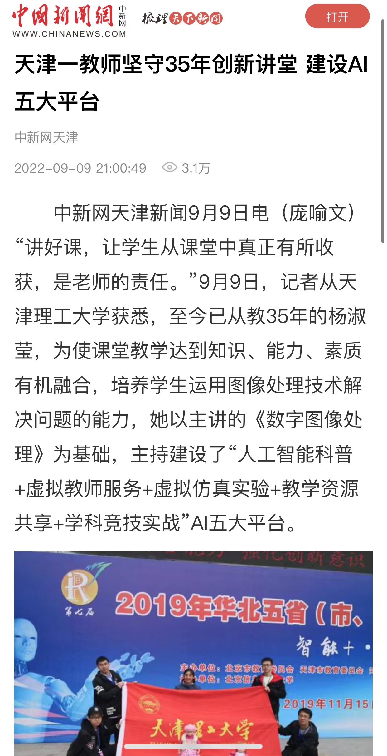 9月9日,在第38个教师节即将到来之际,中新网天津新闻报道我校计算机科学与工程学院教授、国家级一流课程《数字图像处理》负责人杨淑莹,从教35年坚守讲台尚创新,甘当红烛育英才的教育故事,内容如下: